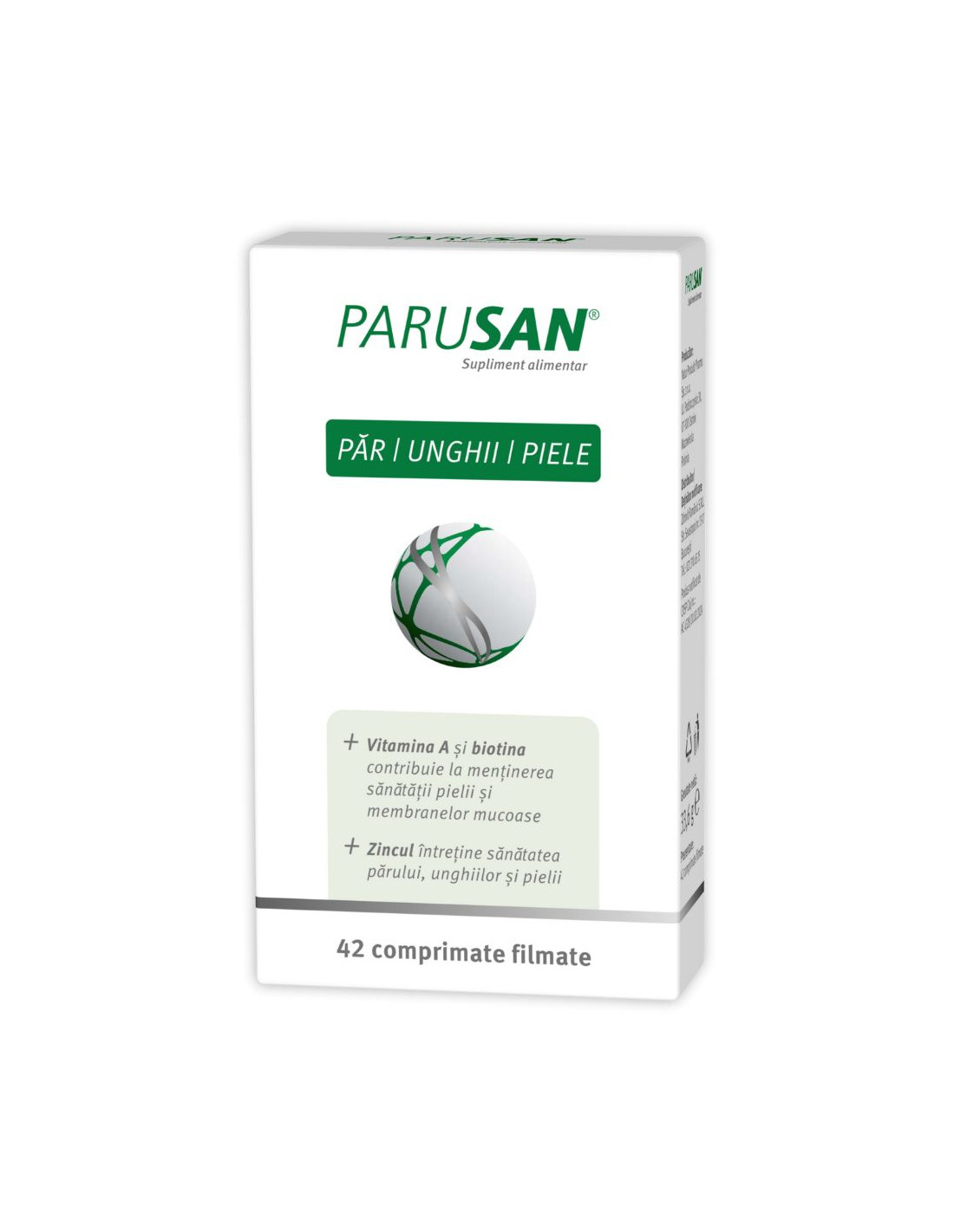 Parusan 42 comprimate filmate este un supliment alimentar destinat susținerii frumuseții și sănătății pielii, părului și unghiilor. Formula sa include ingrediente precum biotină, colagen hidrolizat, hialuronat de sodiu, zinc, cupru și extracte vegetale (urzică, coada-calului).