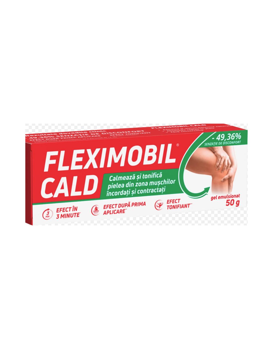 Fleximobil Cald gel emulsionat 50 g este un gel topic care oferă o senzație plăcută de căldură și are rol calmant pentru mușchii încordați și zona articulară. Formula sa emulsionată se absoarbe rapid în piele, fără a lăsa reziduuri grase, și contribuie la relaxarea țesuturilor contractate.