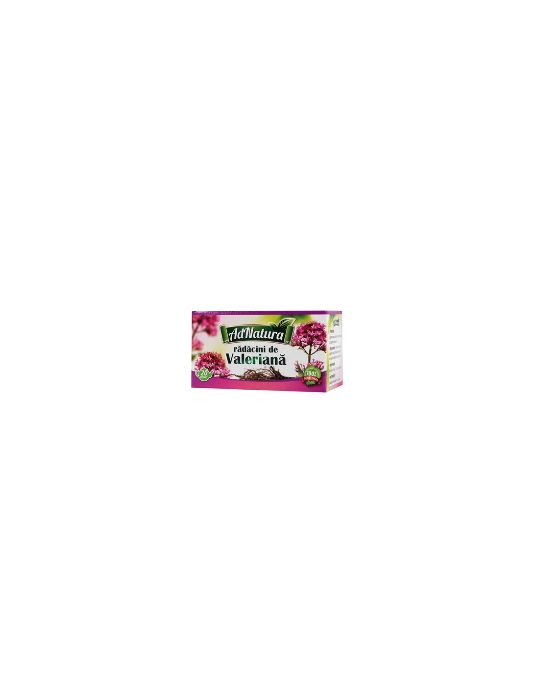 Ceaiul de Valeriană de la AdNatura este o băutură vegetală naturală prezentată în 20 de plicuri, ce utilizează rădăcina plantei Valeriana officinalis. Produsul este recomandat pentru susținerea stării de calm, facilitarea instalării somnului și susținerea sănătăţii mentale în situaţii de tensiune sau stres.