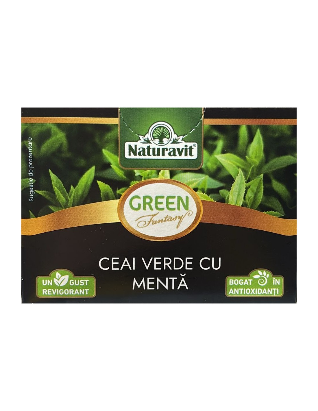 Ceai Verde cu Mentă Fantasy x 15 plicuri Naturavit este un ceai fin, aromat și revigorant, realizat din frunze de ceai verde atent selecționate, combinate cu mentă pentru un gust proaspăt și răcoritor. Această asociere este recunoscută pentru proprietățile antioxidante, tonice și energizante ale ceaiului verde, alături de efectul digestiv și calmant al mentei.