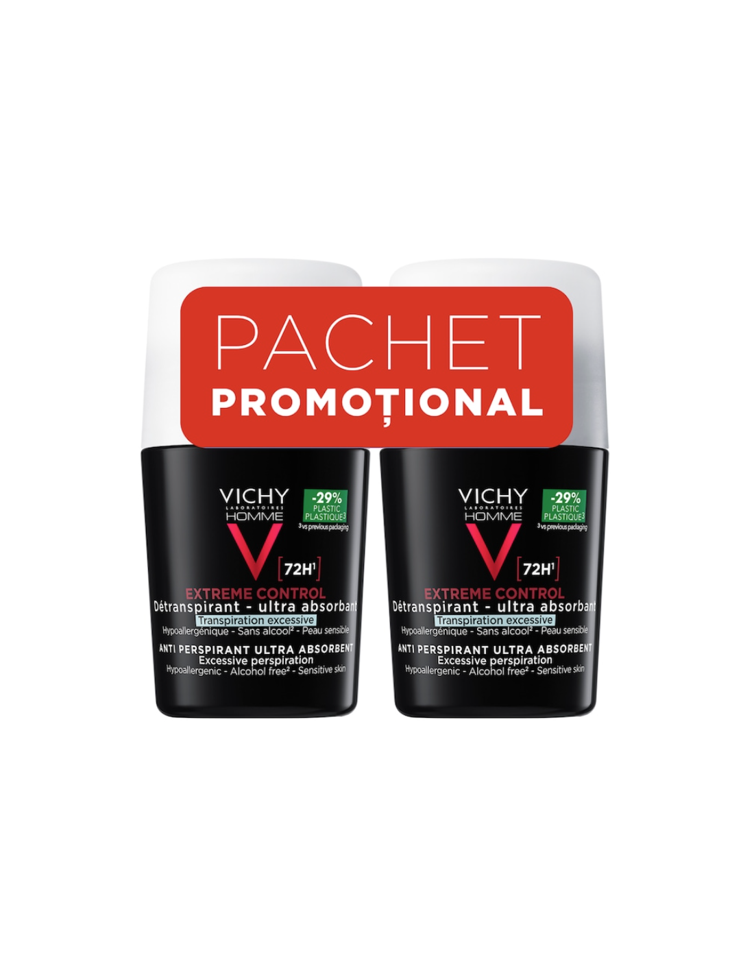 Vichy Deo Roll-On Homme Control Extrem 72h, 50 ml, bipack ofera protectie extrema si confort zilnic, fiind solutia ideala pentru controlul transpiratiei.