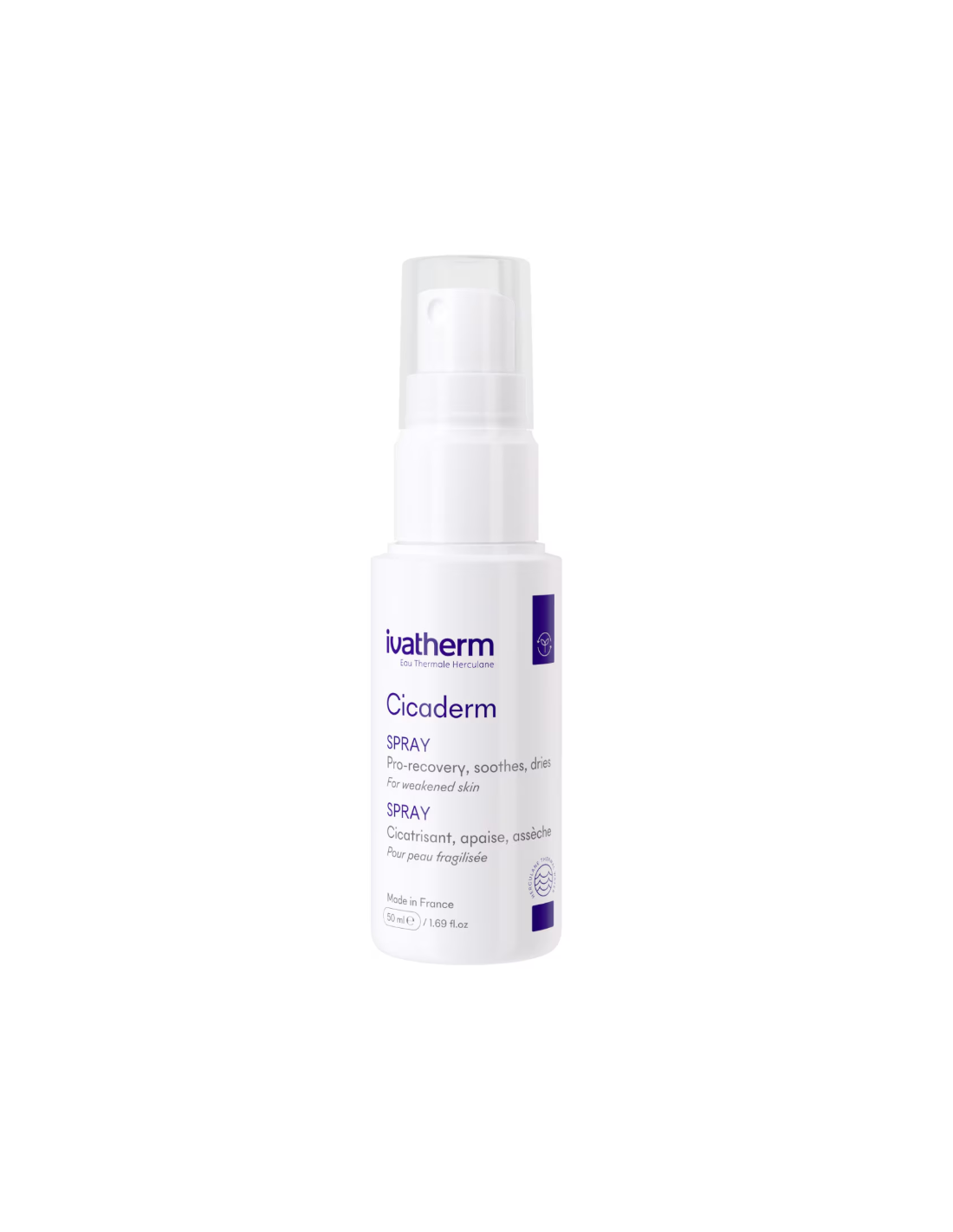 Cicaderm Spray de la Ivatherm este un spray reparator conceput pentru leziunile umede, zone greu accesibile sau zone care nu suportă atingerea directă. Formula include Mimosa tenuiflora, oxid de zinc, smectită, cu rol de absorbție a exudatului și protecție a pielii lezate.
