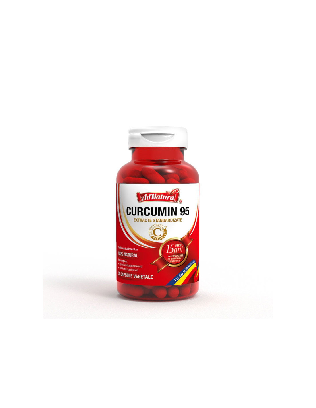 AdNatura Curcumin 95 – 30 capsule este un supliment alimentar pe bază de extract natural din turmeric (Curcuma longa), standardizat la 95% curcuminoide, cu proprietăți antiinflamatoare, antioxidante și detoxifiante. Ideal pentru sănătatea articulațiilor, ficatului și sistemului imunitar.