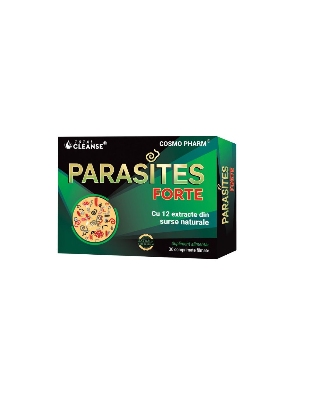 Parasites Forte / Parasites Total Cleanse – 30 comprimate este un supliment alimentar antiparazitar conceput pentru a elimina paraziții intestinali și ouăle acestora și pentru a reface flora intestinală după infestație.