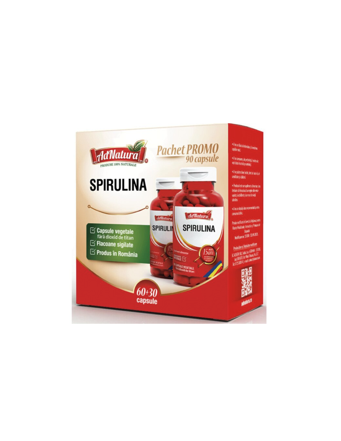 Pachet Spirulină 60 + 30 capsule – AD NATURA este o ofertă promoţională ce conține 90 capsule (60 + 30) de Spirulină – o algă verde-azurie cunoscută pentru conţinutul său remarcabil în proteine, clorofilă, fier şi antioxidanţi.