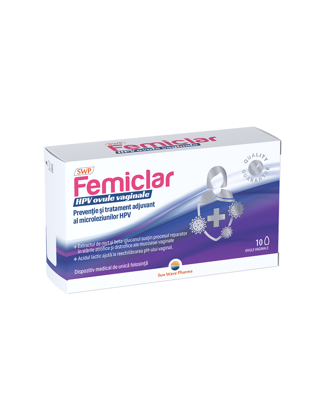 Femiclar HPV este un dispozitiv medical conceput pentru susținerea regenerării mucoasei vaginale și refacerea echilibrului florei, în special în cazul microleziunilor cauzate de infecția cu virusul HPV. Formula sa conține beta-glucan, acid lactic și extract de mirt, recunoscute pentru proprietățile lor antiinflamatoare, imunomodulatoare și regeneratoare. Produsul este fabricat de Sun Wave Pharma și se administrează local, sub formă de ovule vaginale.
