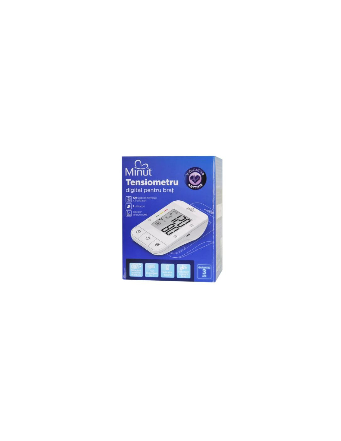 Minut BP163A – Tensiometru automat de braț cu mansetă reglabilă 22–42 cm, ideal pentru uz casnic, oferind măsurare precisă a tensiunii arteriale și pulsului.