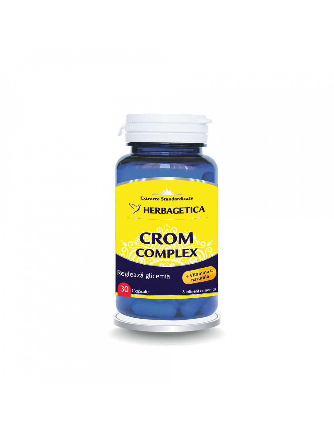 Crom Complex este un supliment 100% natural ce conține vitamine și minerale esențiale pentru reglarea glicemiei, reducerea colesterolului și susținerea sănătății cardiovasculare. Formula include crom organic, vitamina C naturală și drojdie de bere, oferind un suport complet pentru metabolismul carbohidraților și gestionarea greutății.