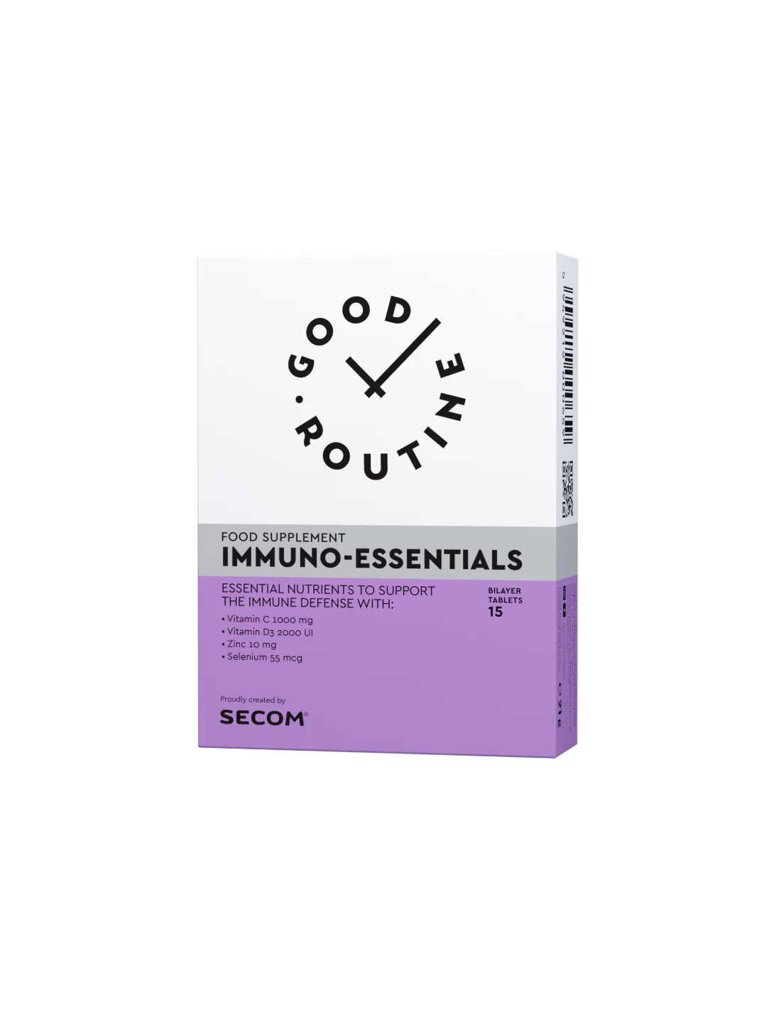 Immuno-Essentials Good Routine – 15 comprimate dublu-strat este un supliment alimentar conceput pentru susținerea sistemului imunitar pe tot parcursul zilei prin eliberare controlată a nutrienților esențiali.*