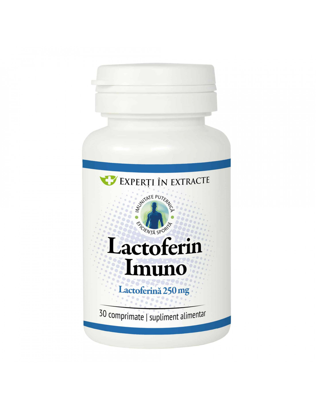 Lactoferin Imuno – 30 comprimate este un supliment alimentar din gama „Experți în Extracte” Dacia Plant, cu o formulă 100 % naturală ce combină 250 mg lactoferină, extract de amla (bogat în vitamina C), echinacea și uleiuri esențiale citrice.