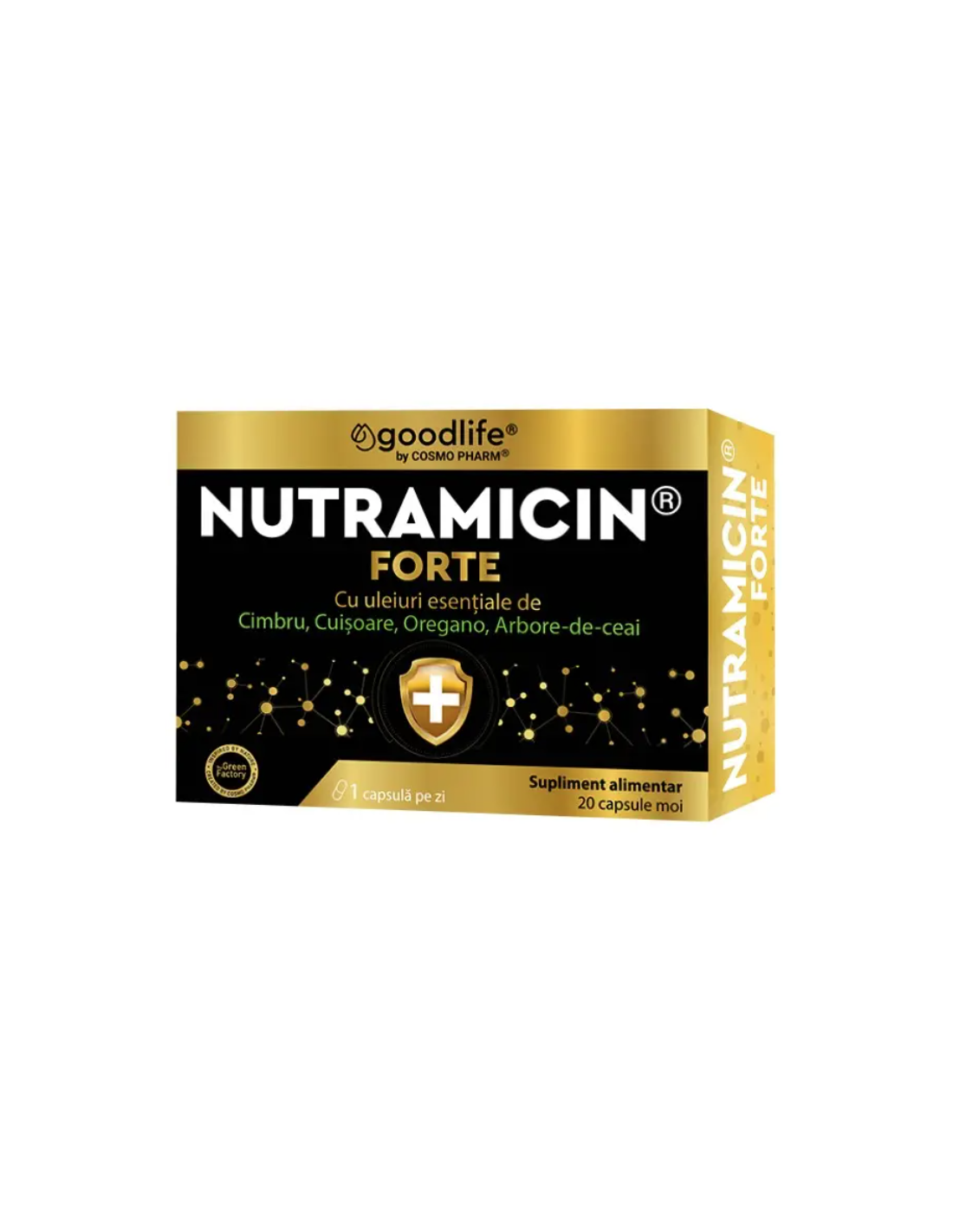 Nutramicin Forte – 20 capsule moi este un supliment alimentar ce conține un amestec de uleiuri esențiale integrale 100 % naturale: cimbru de cultură, cuisoare, oregano și arbore de ceai.
