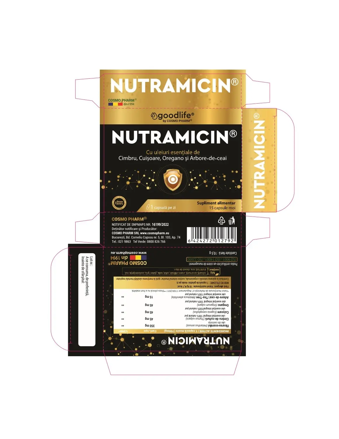 Nutramicin – 15 capsule moi de la Cosmopharm este un supliment alimentar care conține un amestec de uleiuri esențiale naturale (cimbru, cuisoare, oregano, arbore de ceai) în doze echilibrate.
