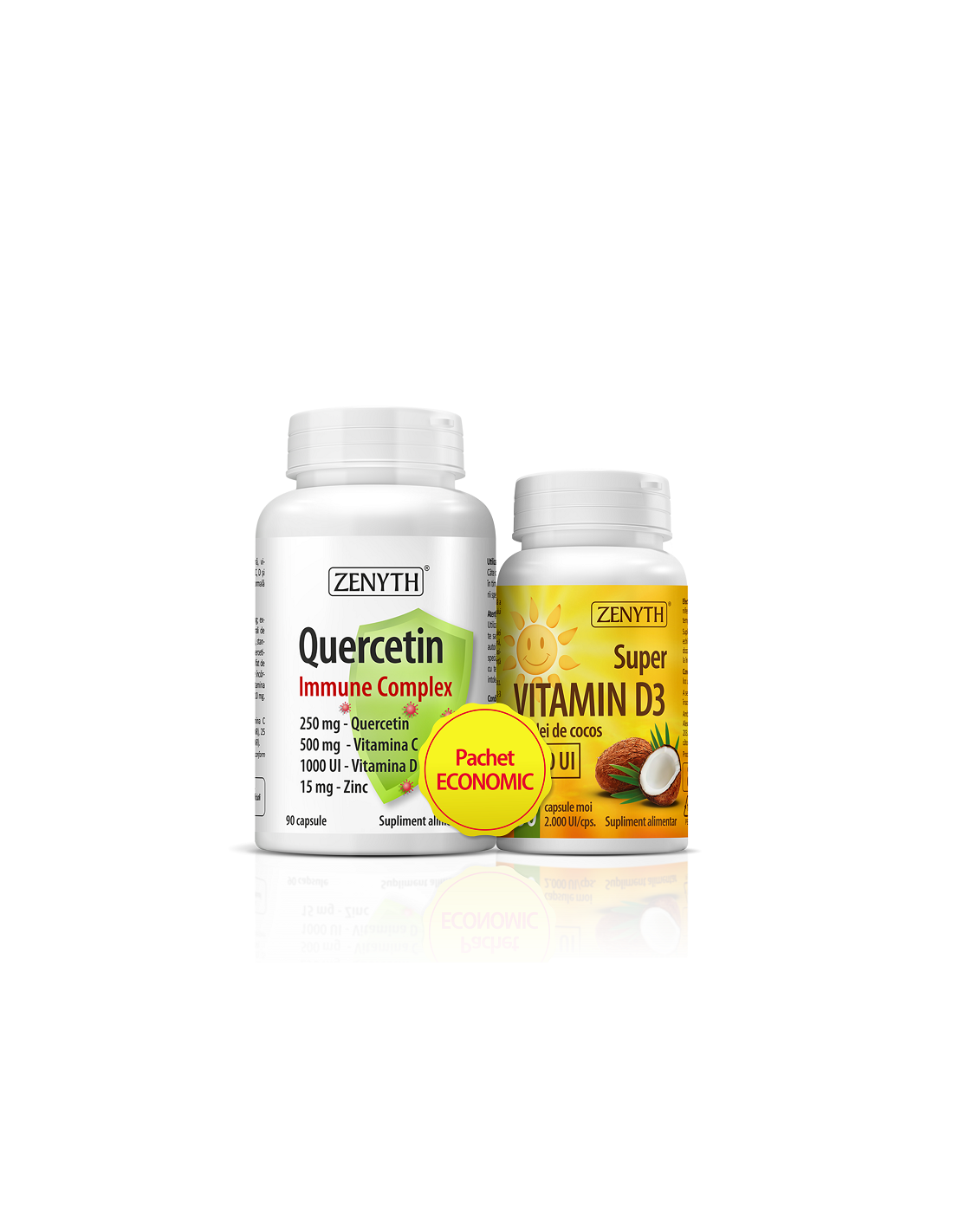 Acest pachet combină formula **Quercetin Immune Complex (90 capsule)** cu **Supervitamina D3 2.000 UI (30 capsule)**, oferind un suport dublu pentru sistemul imunitar. Quercetina, vitamina C, zincul și vitamina D3 acționează sinergic pentru apărare antioxidantă și reglarea răspunsului imun.
