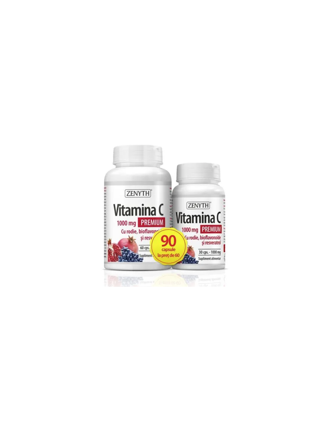 Vitamina C Premium de la Zenyth este un supliment alimentar avansat ce combină o doză mare (1000 mg) de acid ascorbic cu extract de rodie, bioflavonoide și resveratrol, creând un produs sinergic ce sprijină sistemul imunitar și funcțiile antioxidante.