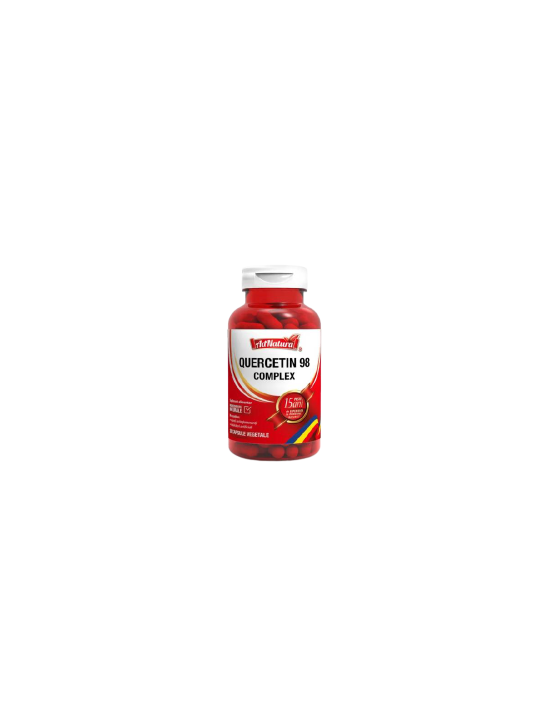 Quercetin 98 Complex AdNatura este un supliment alimentar concentrat, cu acțiune antioxidantă și imunomodulatoare, ce combină extract natural de quercetină 98% cu vitamina C din acerola, bromelină și astragalus. Este destinat protecției celulare, susținerii sistemului imunitar și echilibrului natural al organismului în perioade solicitante.