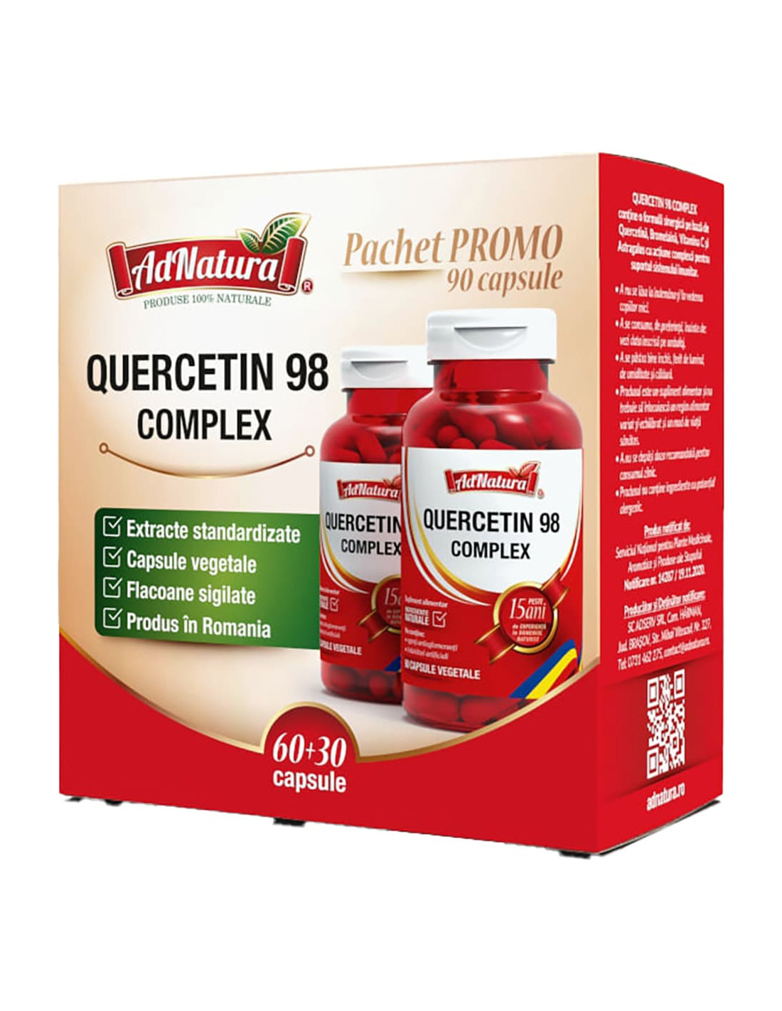 Quercetin 98 Complex AdNatura este un supliment alimentar premium sub forma unui pachet 60 + 30 capsule, ce combină o doză concentrată de quercetină (cel puţin 98% standardizare) cu ingrediente sinergice precum bromelină, vitamina C şi astragalus, pentru un sustinut sprijin al sistemului imunitar, al protecţiei celulare şi al adaptării organismului la factori de mediu solicitanti.