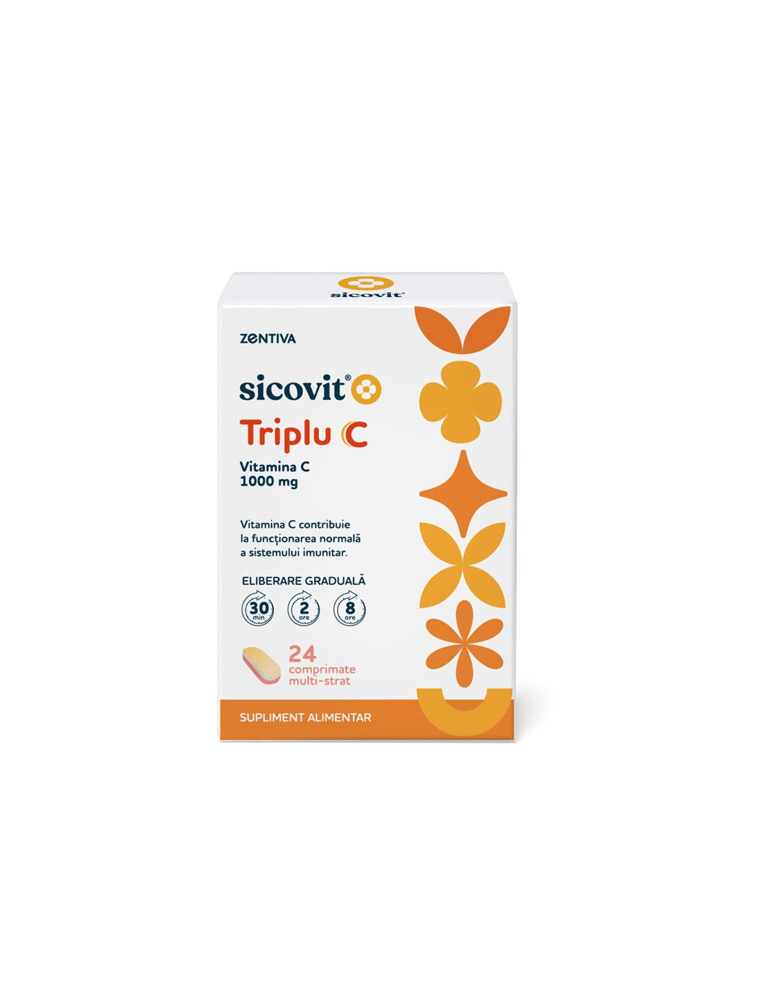 Sicovit Triplu C 1000 mg – 24 comprimate multi-strat este un supliment alimentar cu vitamina C formulat pentru eliberare treptată pe parcursul zilei. Fiecare comprimat conține 1000 mg de acid L-ascorbic distribuit în trei straturi, pentru absorbție susținută.