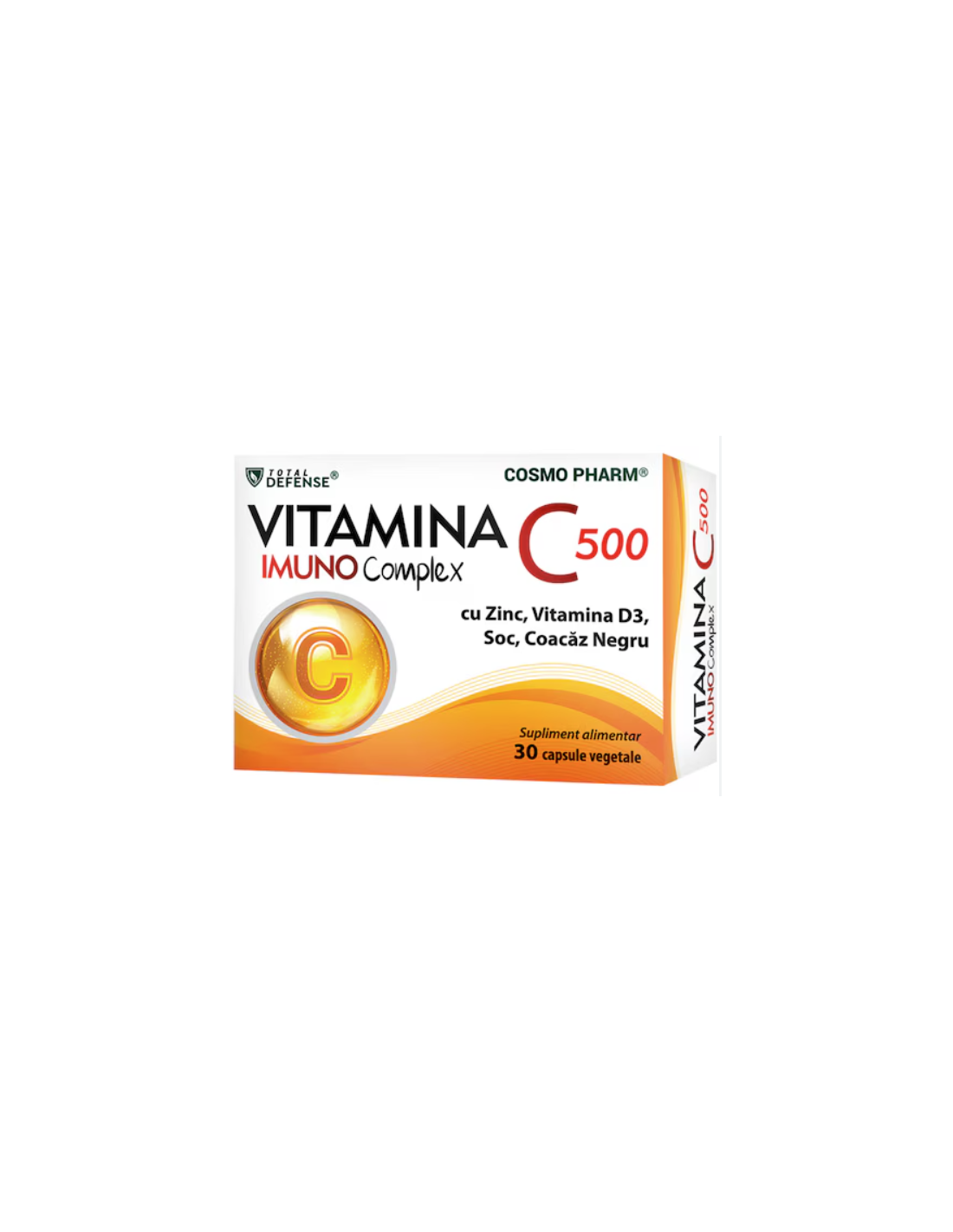Vitamina C 500 Imuno Complex – 30 capsule vegetale – este un supliment formulat pentru a susține sistemul imunitar, combinând vitamina C cu zinc, extract de soc, coacaz negru și vitamina D3.