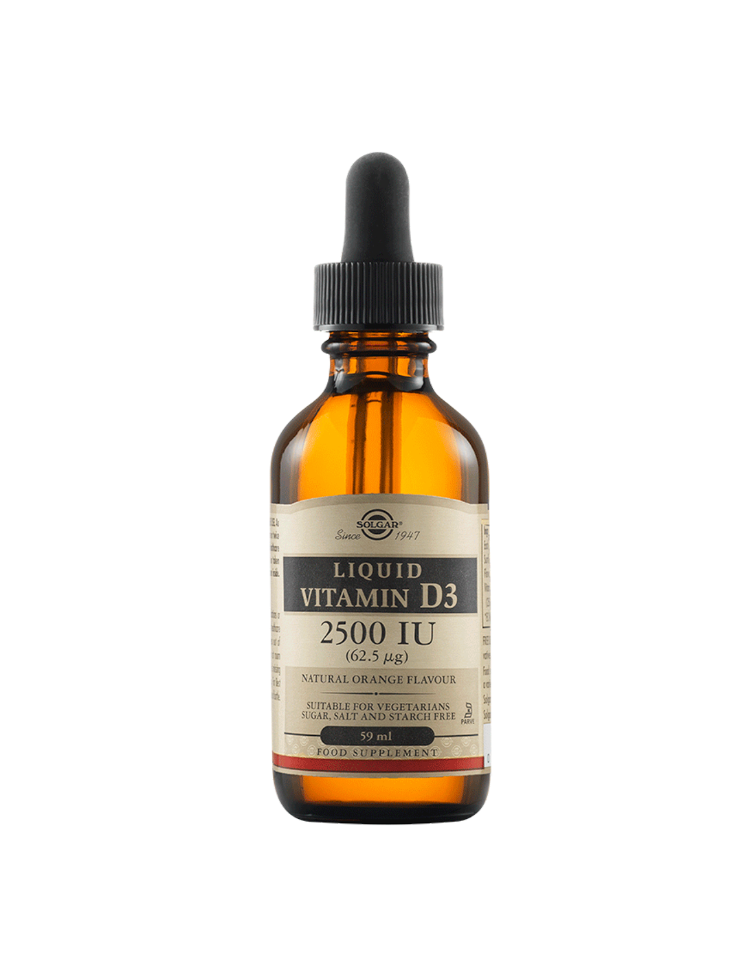 Solgar Vitamina D3 este o formulă lichidă ce oferă 2500 UI (62,5 µg) de *colecalciferol* (vitamina D3) per doză recomandată. Produsul este ideal pentru persoanele care au dificultăți în a înghiți capsule și pentru o absorbție ușoară.