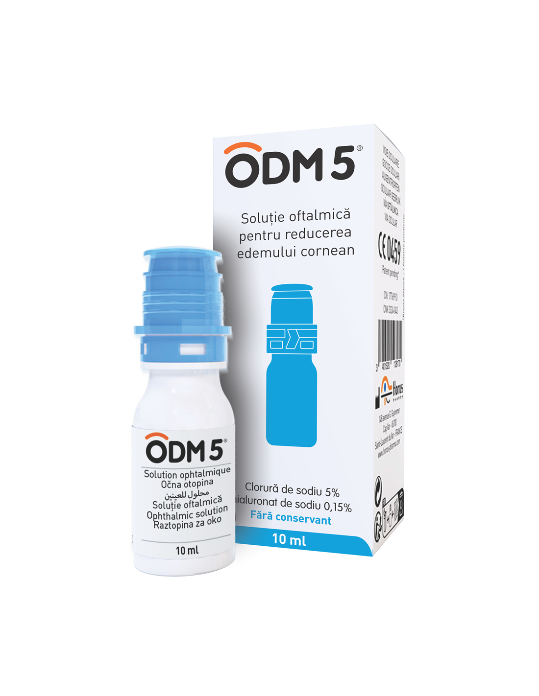 ODM 5 este o soluție oftalmică concepută pentru a ameliora edemul cornean. Formula, fără conservanți, folosește efect osmotici prin clorură de sodiu 5 % și acid hialuronic 0,15 % pentru a elimina excesul de fluid din cornee.