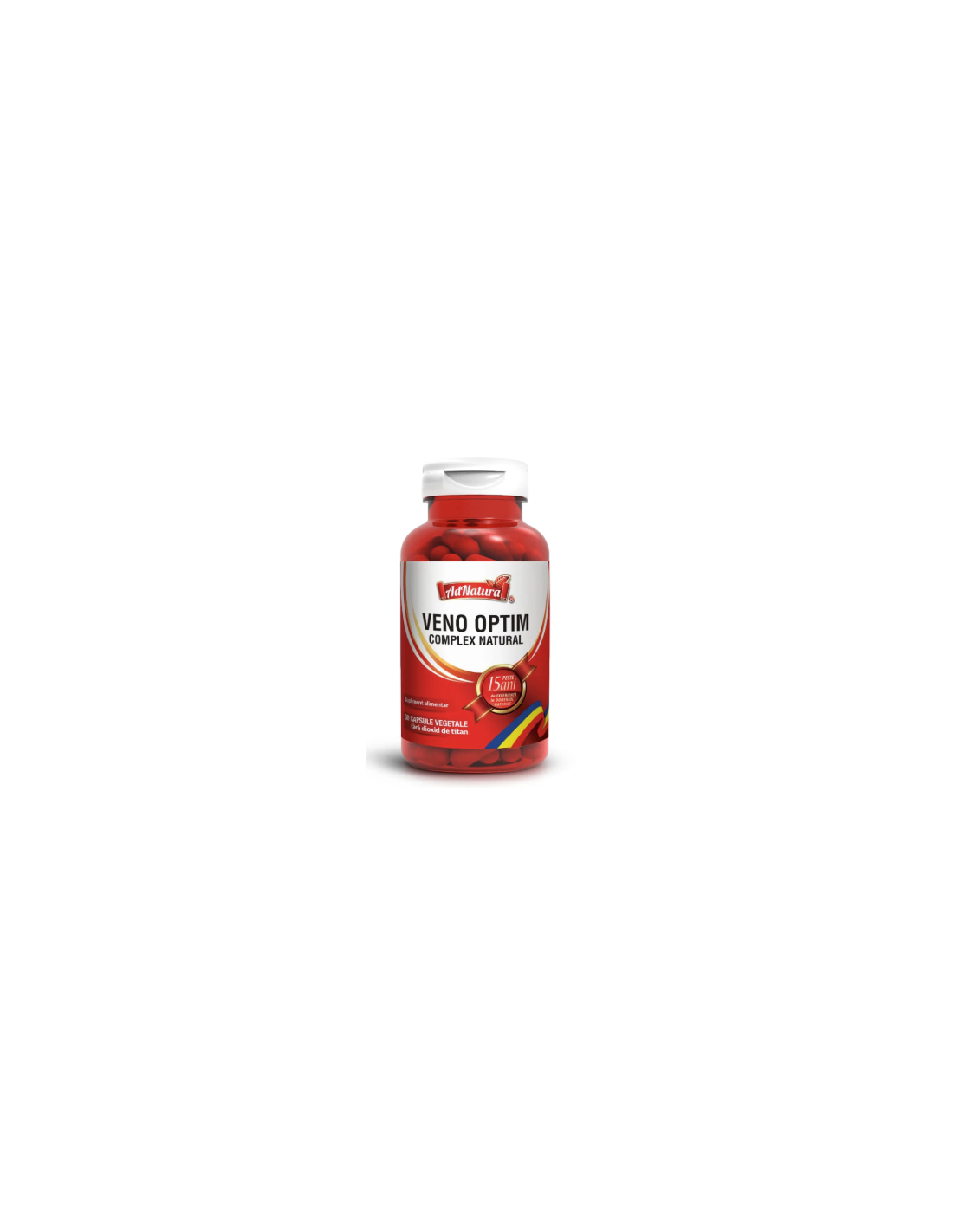 Veno Optim Complex Natural AdNatura este un supliment alimentar bazat pe extracte din plante recunoscute pentru efectele benefice asupra circulației venoase și capilare. Formula conține extract de castan sălbatic, ginkgo biloba, viță roșie și hesperidină, care acționează sinergic pentru întărirea pereților vaselor de sânge, reducerea senzației de greutate în picioare și îmbunătățirea tonusului venos.