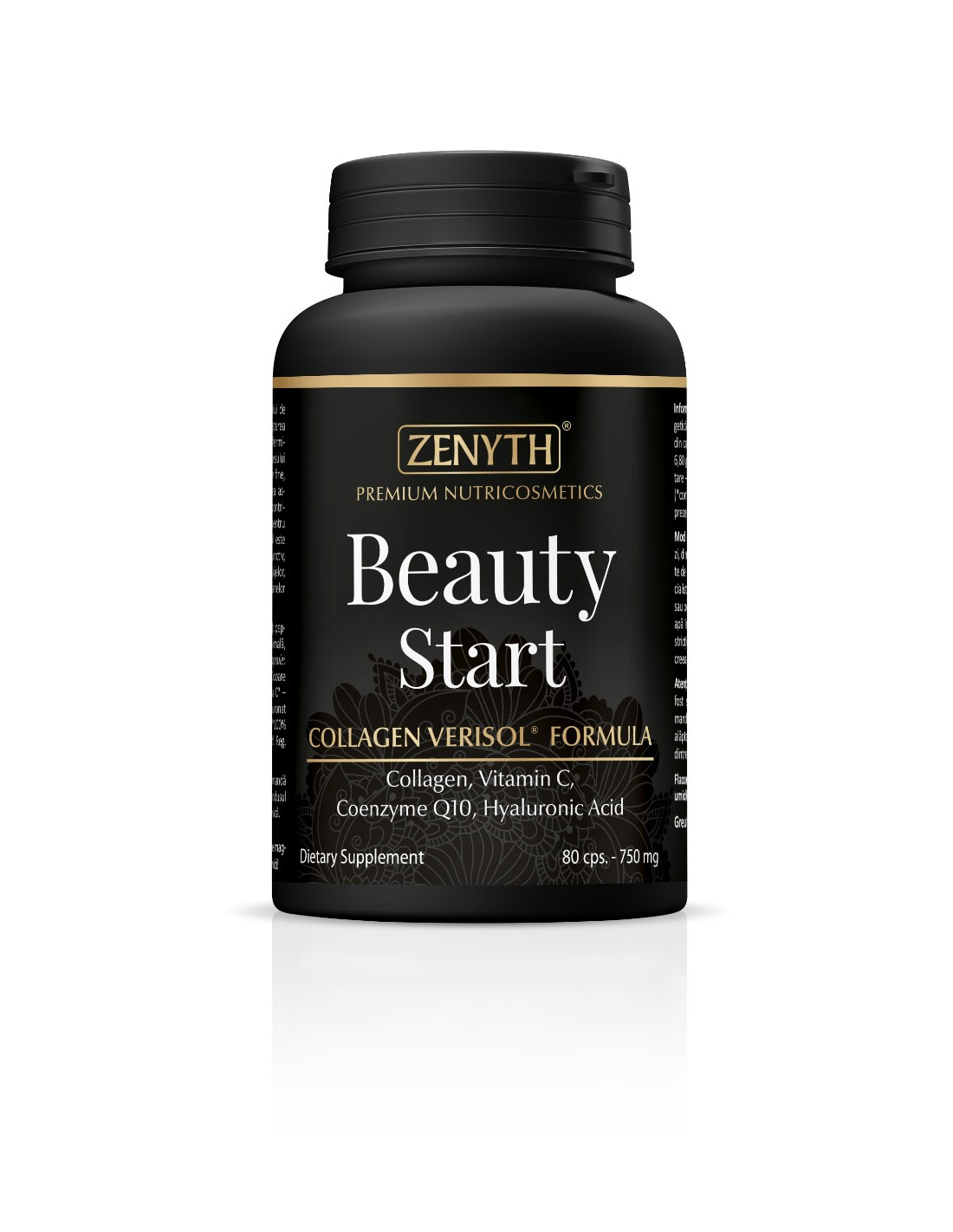Beauty Start 750 mg – 80 capsule, Zenyth este un supliment nutricosmetic destinat susținerii frumuseții pielii, părului și unghiilor. Produsul combină ingrediente premium precum colagen Verisol®, vitamina C, coenzima Q10 și acid hialuronic.