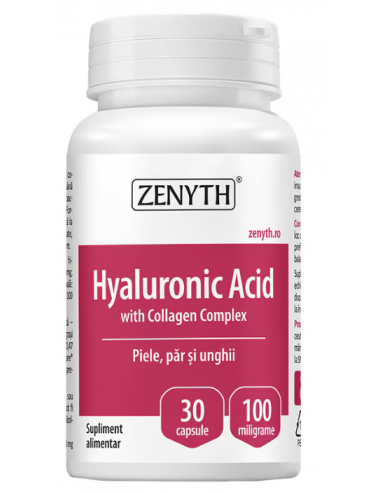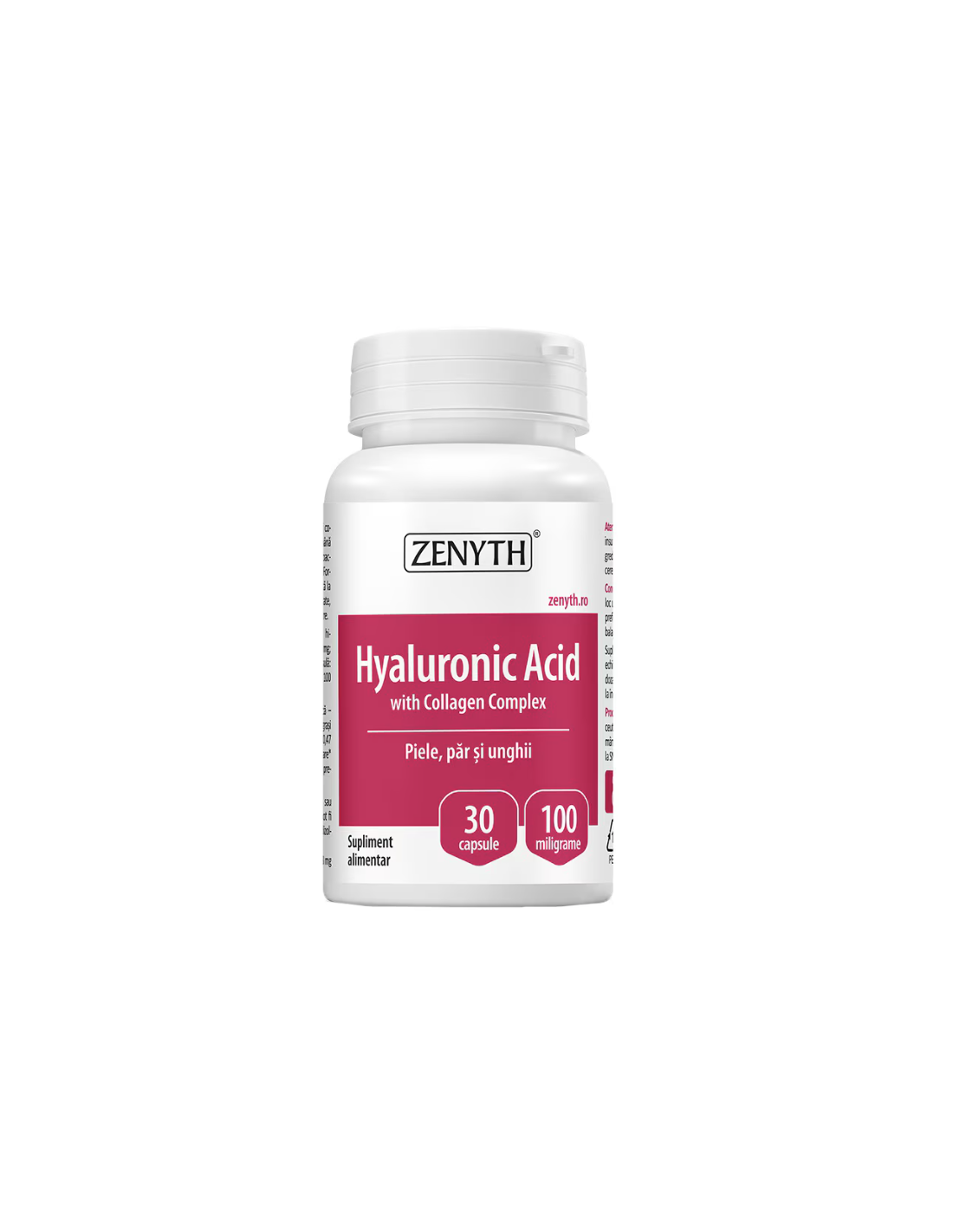 Hyaluronic Acid cu Collagen Complex – 30 capsule, Zenyth este un supliment alimentar ce combină colagen hidrolizat și acid hialuronic pentru a susține frumusețea și sănătatea pielii, părului și unghiilor.