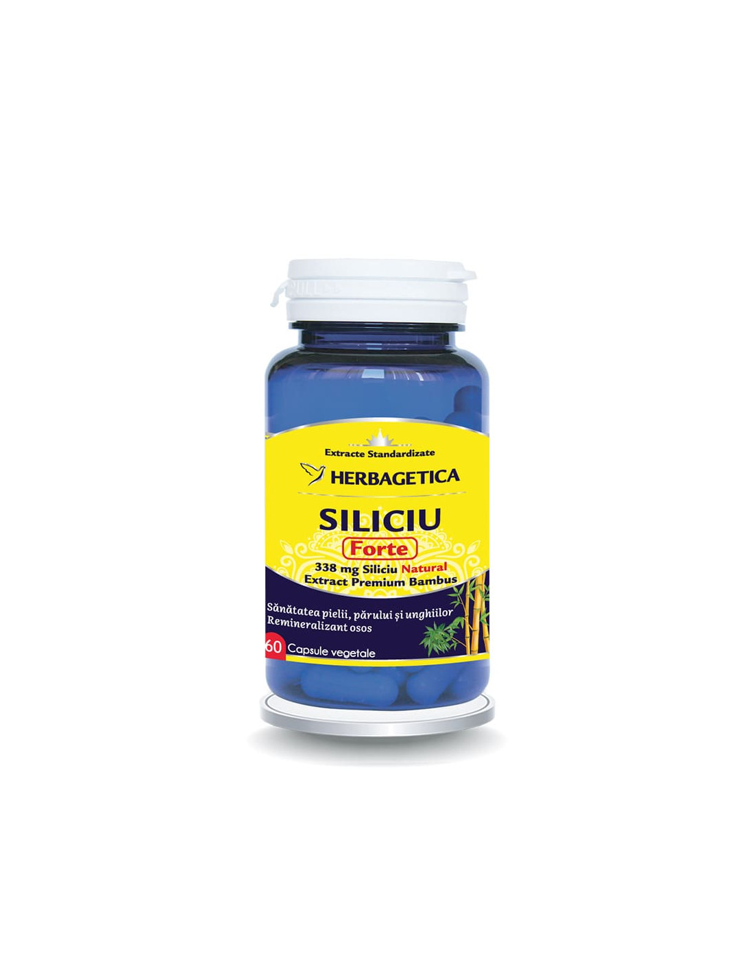 Siliciu Forte este o formulă premium cu 338 mg Siliciu natural per capsulă, extras din bambus, ideală pentru elasticitatea pielii, sănătatea părului, unghiilor și oaselor.