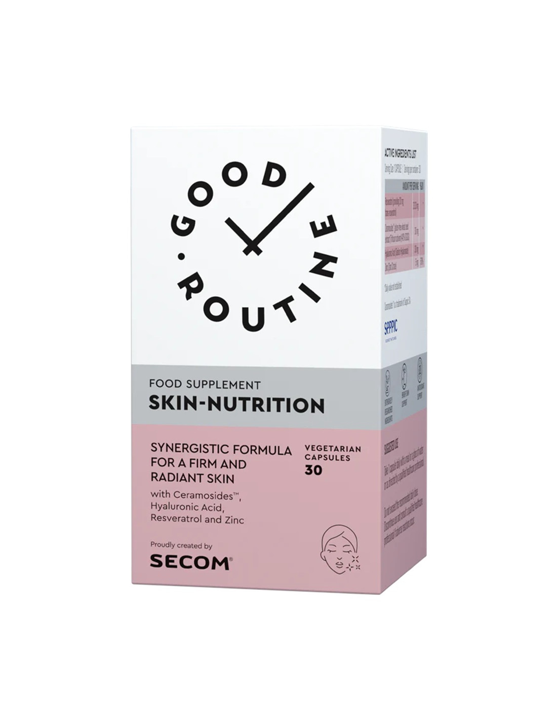 Skin-Nutrition 30 capsule vegetale (Good Routine / Secom) este un supliment alimentar conceput pentru susținerea frumuseții pielii, printr-o formulă sinergică ce combină ingrediente premium precum Ceramosides®, acid hialuronic, resveratrol și zinc.*