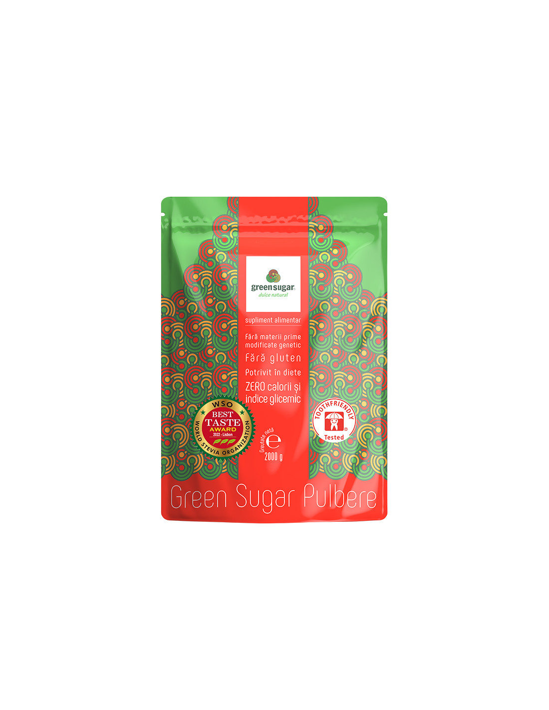 Green Sugar pulbere 2 kg este un îndulcitor 100% natural, creat de Laboratoarele Remedia, bazat pe un amestec echilibrat de eritritol și extract din frunze de Stevia Rebaudiana. Are gust dulce natural, fără amăreală, și poate fi folosit în băuturi, deserturi, prăjituri sau preparate gătite, fără a afecta indicele glicemic.