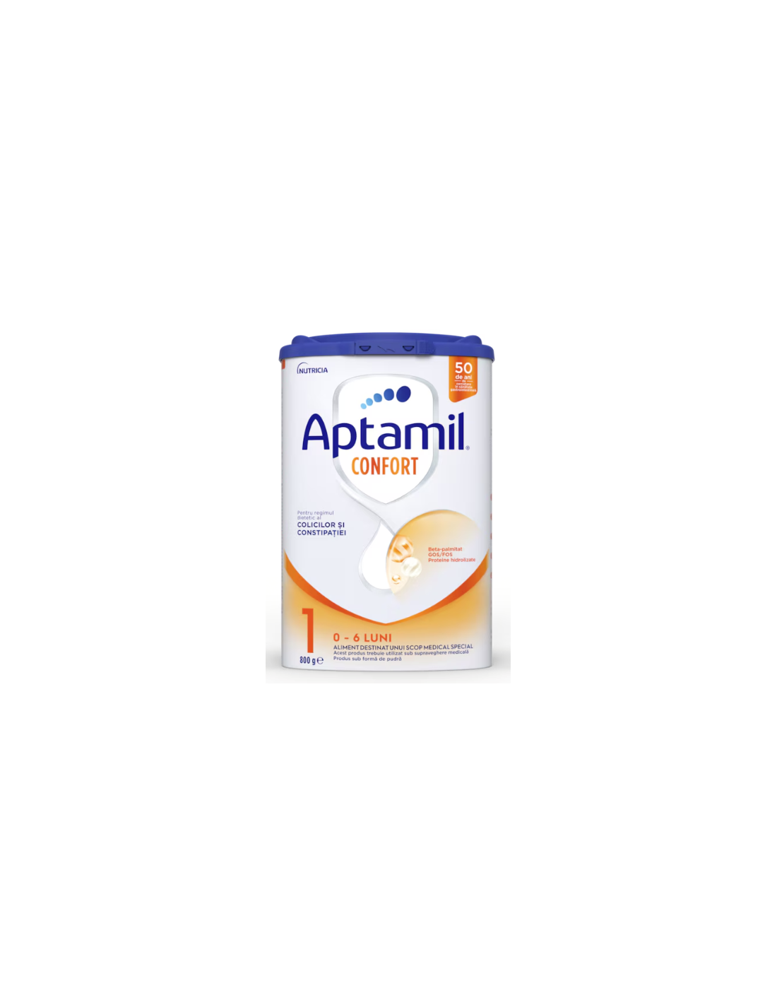 Aptamil Confort 1 (0–6 luni) este o formulă completă pentru scopuri nutriționale medicale speciale, destinată managementului dietetic al colicilor și constipației la sugari. Conține proteine din zer parțial hidrolizate, prebiotice GOS/FOS și un mix lipidic cu beta-palmitat pentru o digestie mai ușoară și scaune moi. Se administrează doar sub supraveghere medicală.