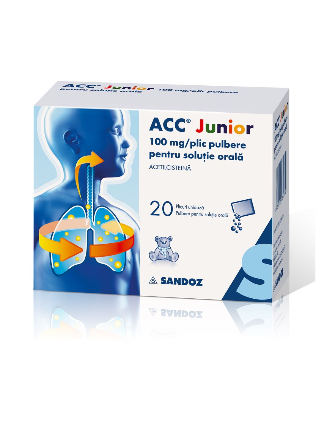ACC Junior 100 mg, produs de Sandoz, este o pulbere pentru soluție orală care conține acetilcisteină 100 mg per plic, utilizată pentru tratamentul tulburărilor de secreţie bronşică vâscoasă, în special în tusea productivă ce însoțește bronșite acute sau cronice, reacutizări de bronhopneumopatie cronică, bronșiectazii.