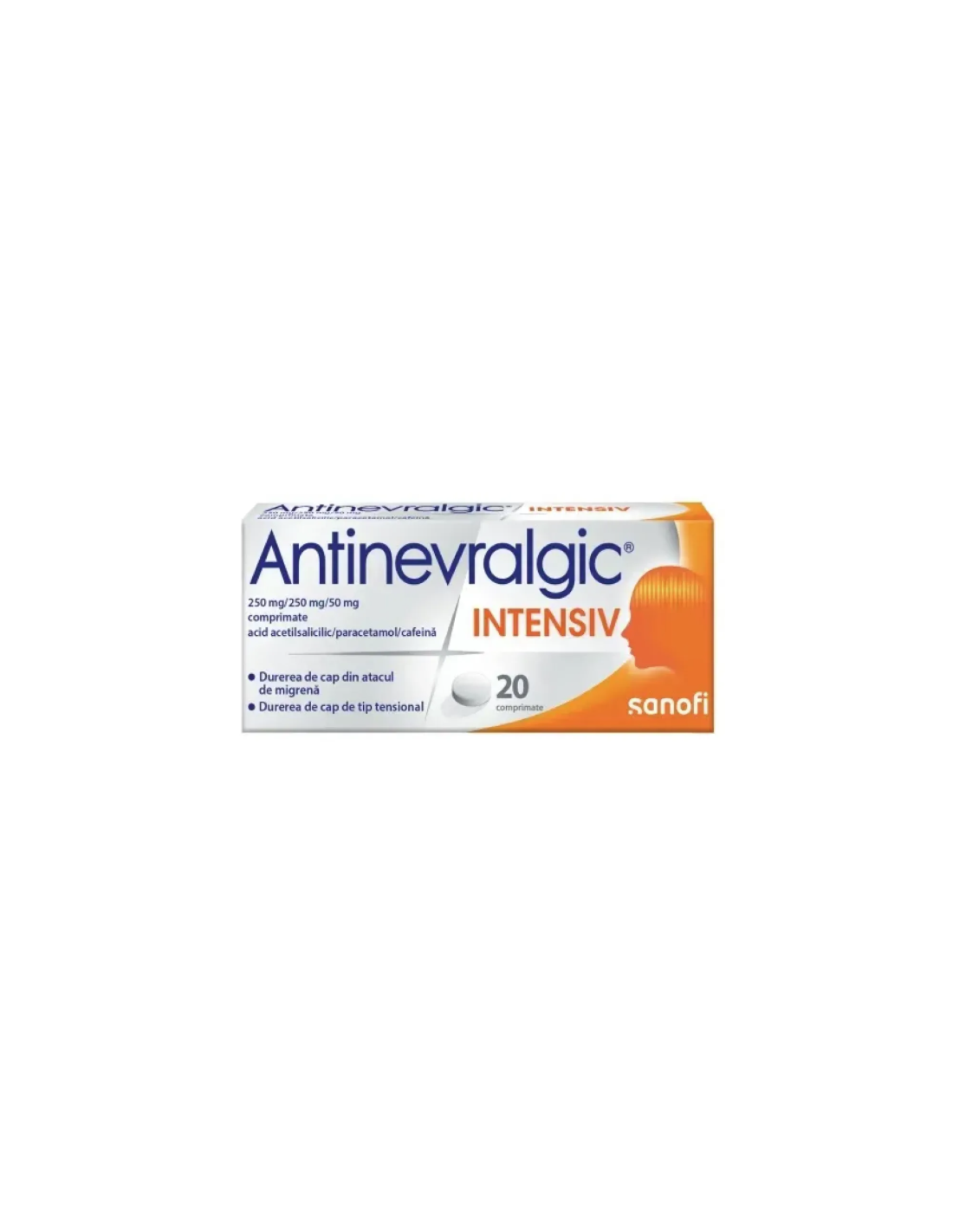 Antinevralgic Intensiv este un medicament analgezic combinat care conține trei substanțe active: acid acetilsalicilic 250 mg, paracetamol 250 mg și cafeină 50 mg.