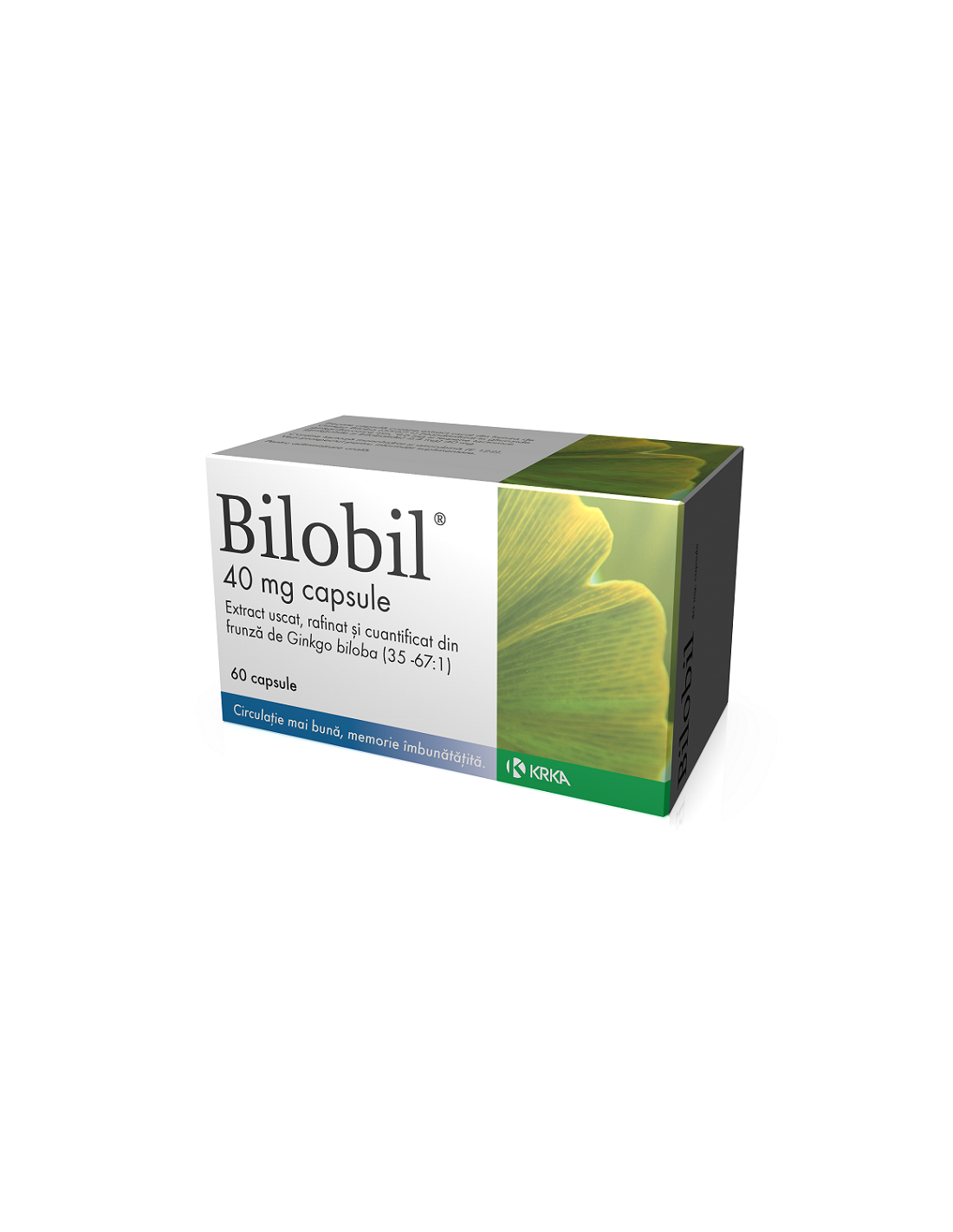 Bilobil 40 mg x 60 capsule este un supliment alimentar pe bază de extract standardizat de Ginkgo biloba, conceput pentru a susține sănătatea creierului și circulația sângelui la nivel cerebral și periferic. Produsul este fabricat de KRKA, un producător farmaceutic de încredere, recunoscut pentru calitatea și eficiența preparatelor sale naturale.