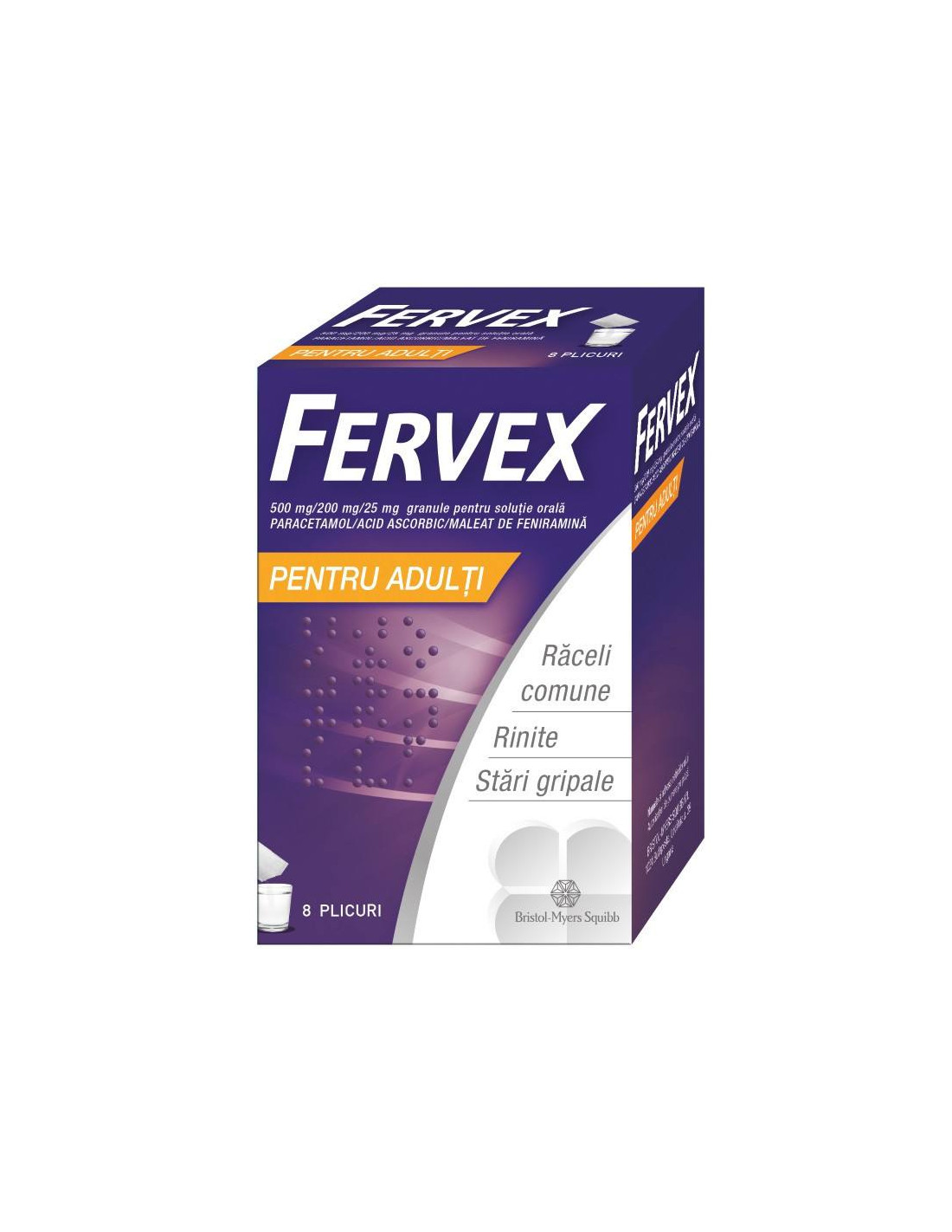 Fervex pentru adulți (8 plicuri) este un medicament OTC produs de UPSA, destinat tratamentului simptomatic al răcelilor comune, rinitelor alergice/vasomotorii și stărilor gripale. Indicații terapeutice