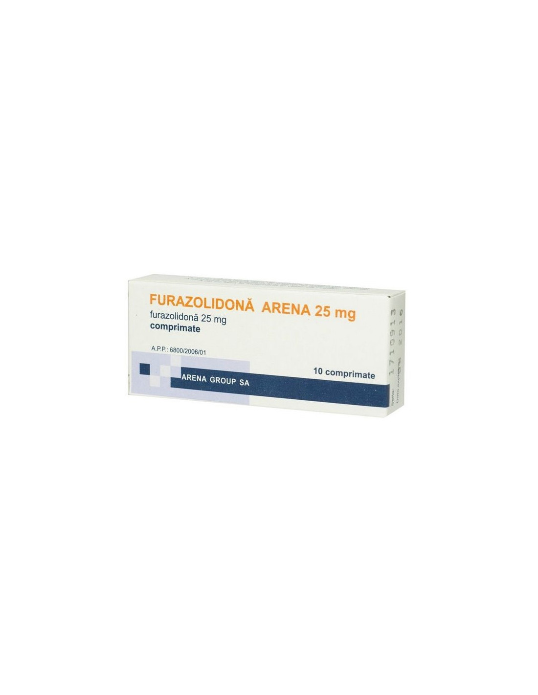Furazolidona 25 mg, produs de Arena Group, este un medicament fără prescripţie medicală (OTC) destinat tratării infecţiilor intestinale cauzate de germeni sensibili la furazolidonă – inclusiv enterite, enterocolite infectioase, dizenterii şi toxiinfecţii alimentare.