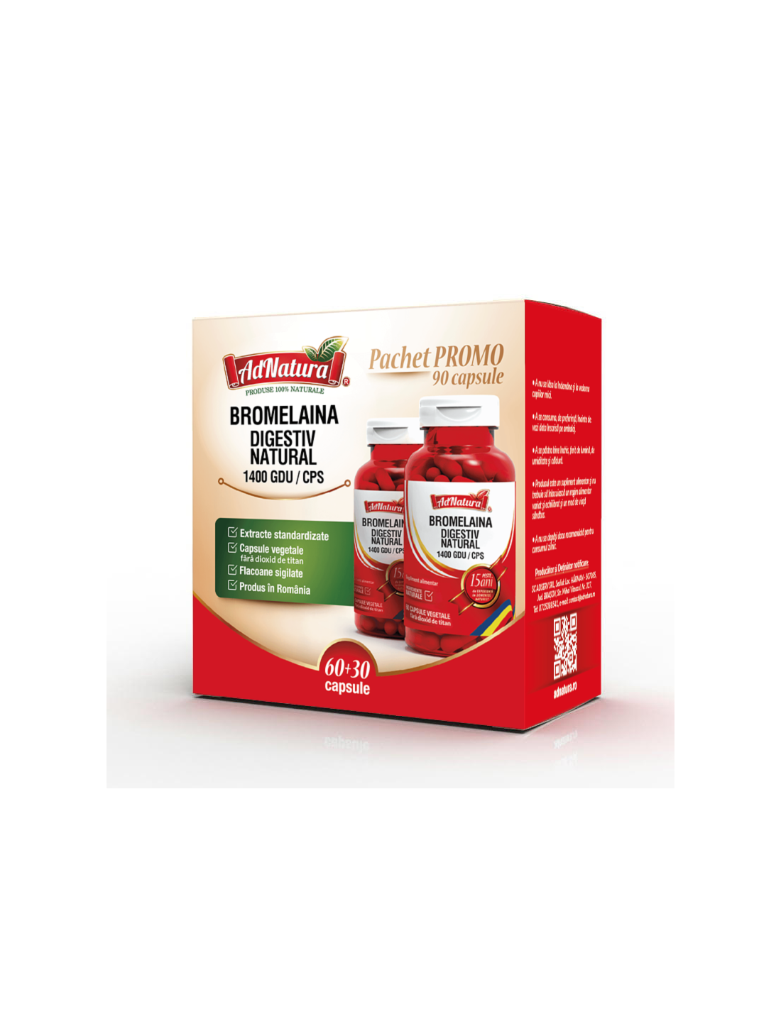 AdNatura Bromelaină Digestiv Natural 1400 GDU – pachet 60 + 30 capsule este un supliment alimentar pe bază de enzimă proteolitică extrasă din tulpina de ananas (Ananas comosus), cu rol esențial în digestia proteinelor și susținerea proceselor antiinflamatorii naturale din organism.