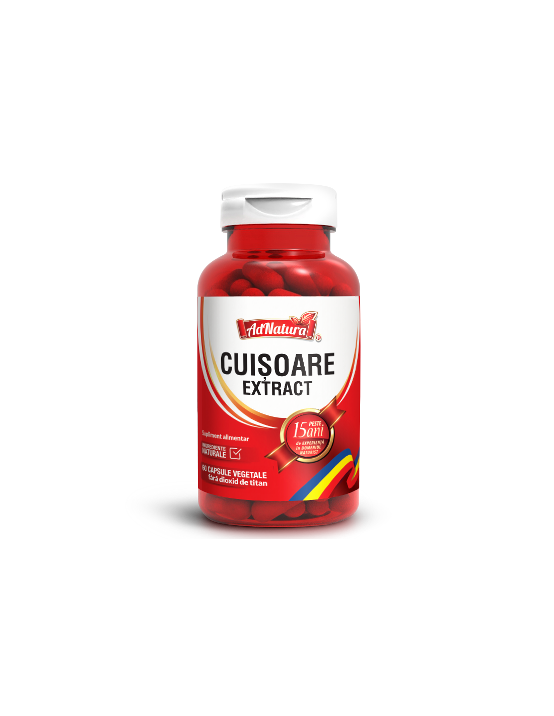 AdNatura Cuișoare extract – 60 capsule este un supliment alimentar natural obținut din extract concentrat de cuișoare (Syzygium aromaticum), bogat în uleiuri esențiale și compuși activi cu efect antioxidant, antibacterian și antiparazitar. Este recomandat pentru susținerea imunității și sănătății aparatului digestiv.