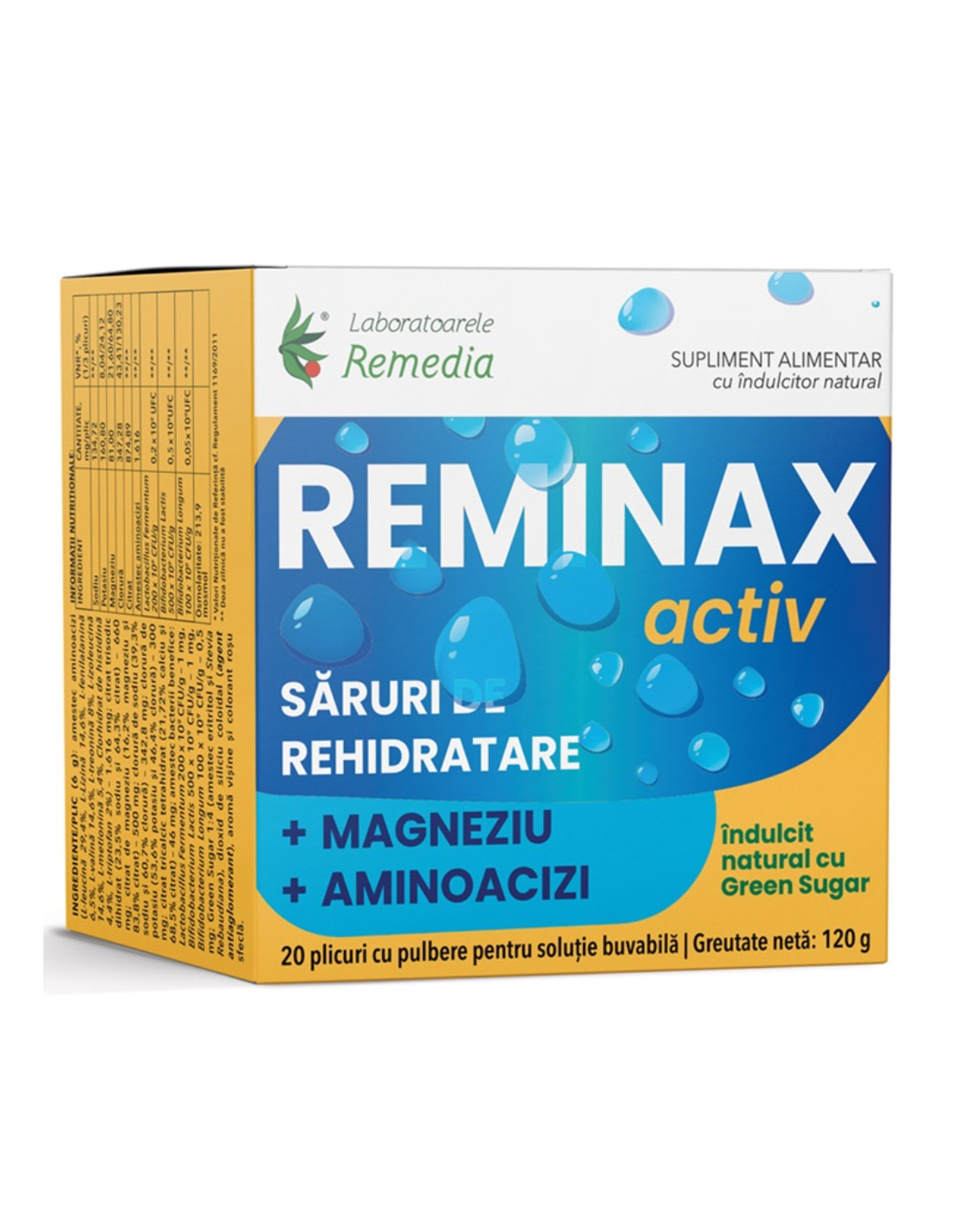 Reminax Active este un supliment alimentar conceput pentru a susține refacerea rapidă a hidratației și echilibrului electrolitic, combinând saruri de rehidratare și un aport de **magneziu** și **aminoacizi**. Este ideal pentru situații de stres hidric: diaree, transpirație excesivă, efort intens sau condiții climatice extreme.