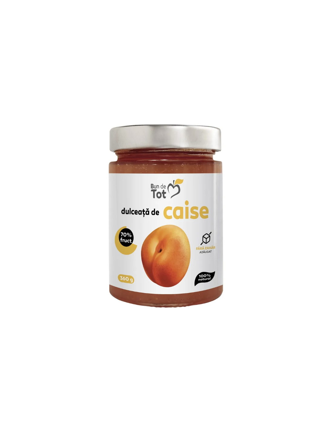 Dulceață de caise „Bun de Tot” 360 g este un produs 100 % natural de la Dacia Plant, fără zahăr adăugat, realizat din caise atent selecționate și îndulcit cu suc de struguri cu pulpă. Produsul nu conține conservanți, coloranți sau arome artificiale.