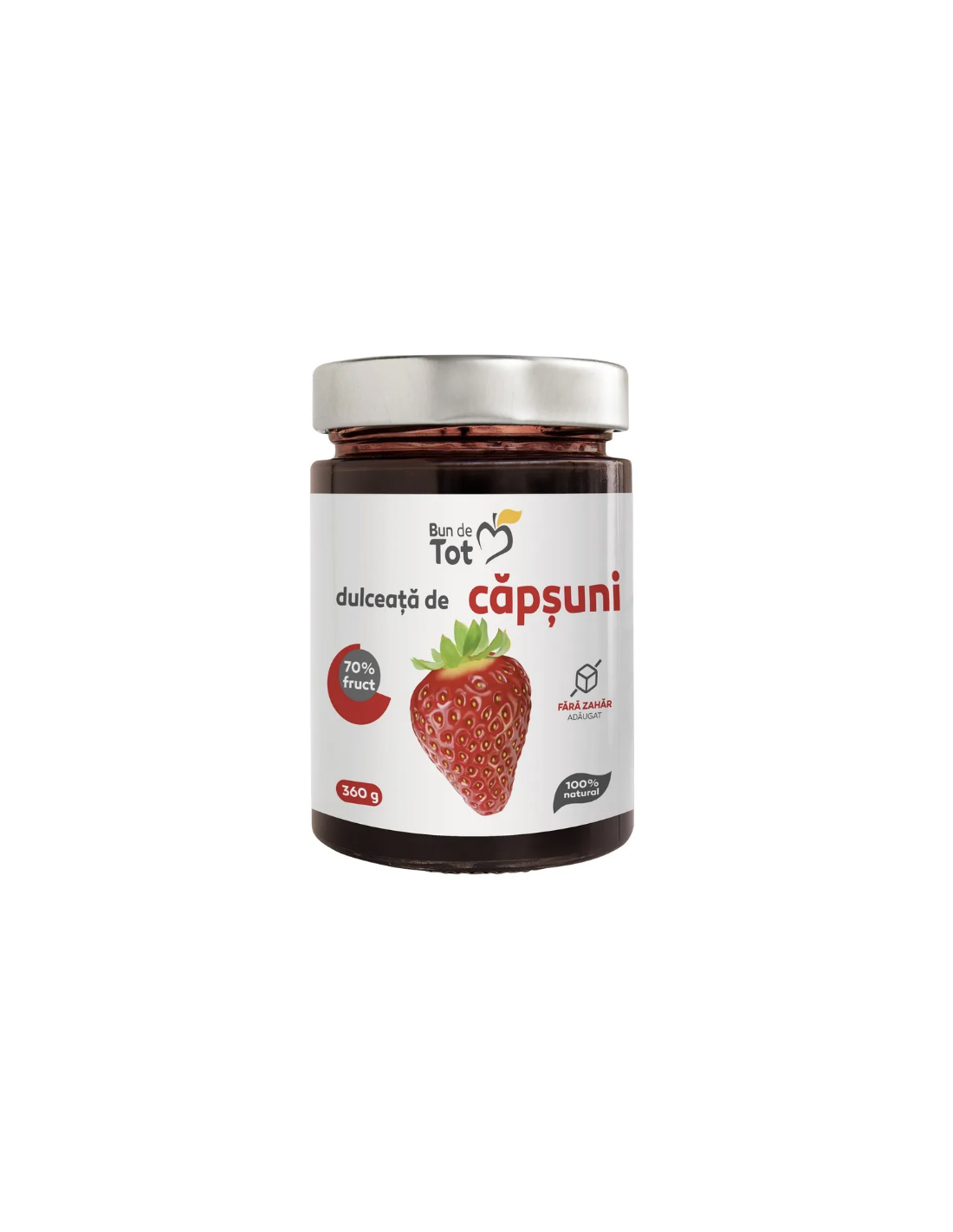 Dulceață de căpșuni „Bun de Tot” 360 g de la Dacia Plant este un produs 100 % natural fără zahăr adăugat, obținut din căpșuni atent selecționate (minim 70 %) și îndulcit cu suc de struguri cu pulpă. Produsul nu conține arome sintetice, E-uri sau conservanți.