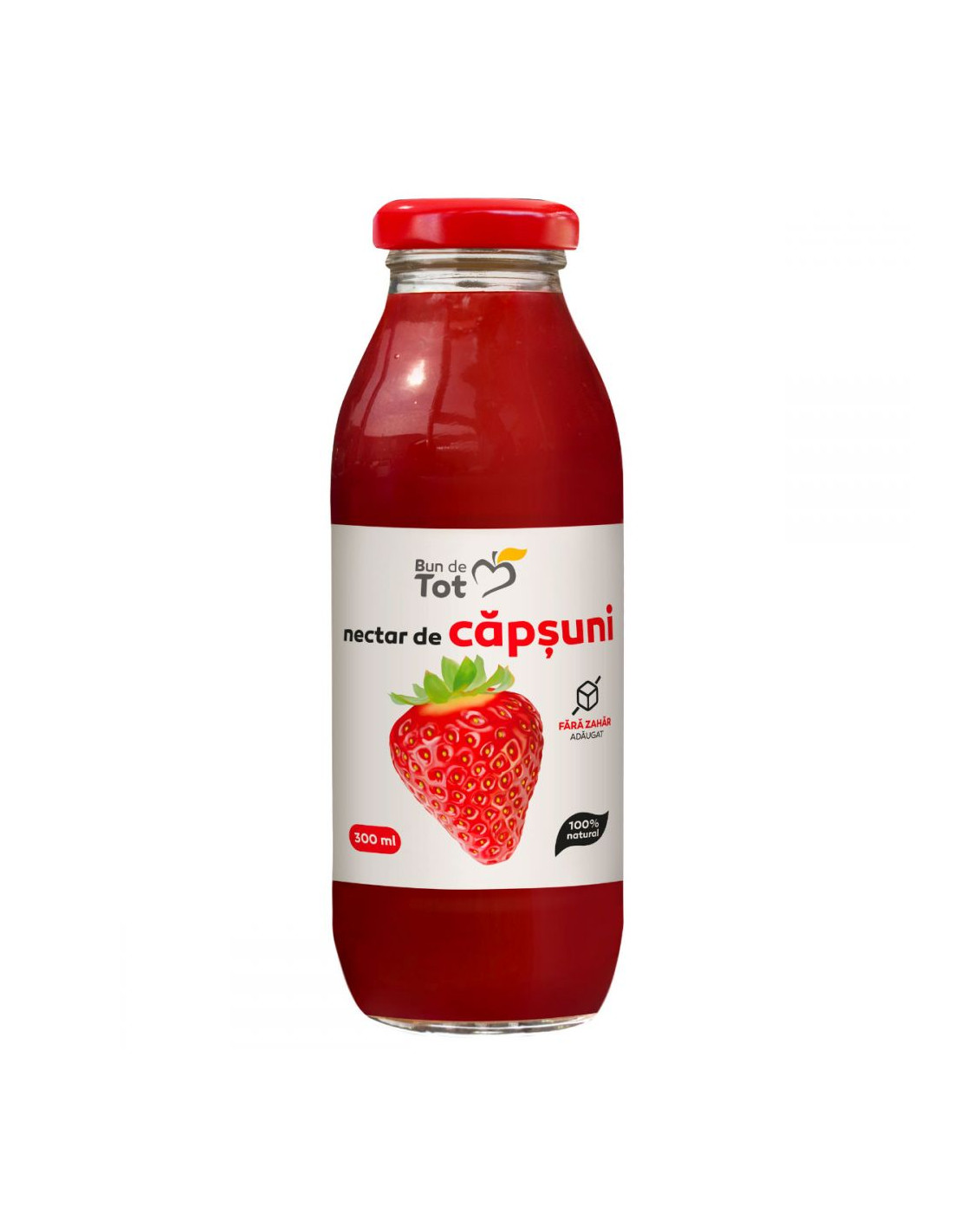Nectar de căpșuni „Bun de Tot” 300 ml de la Dacia Plant este un produs natural, fără zahăr adăugat, preparat din piure de căpșuni (minim 60 %) și suc concentrat de struguri cu pulpă (minim 16 %). Produsul nu conține conservanți, arome artificiale sau coloranți.