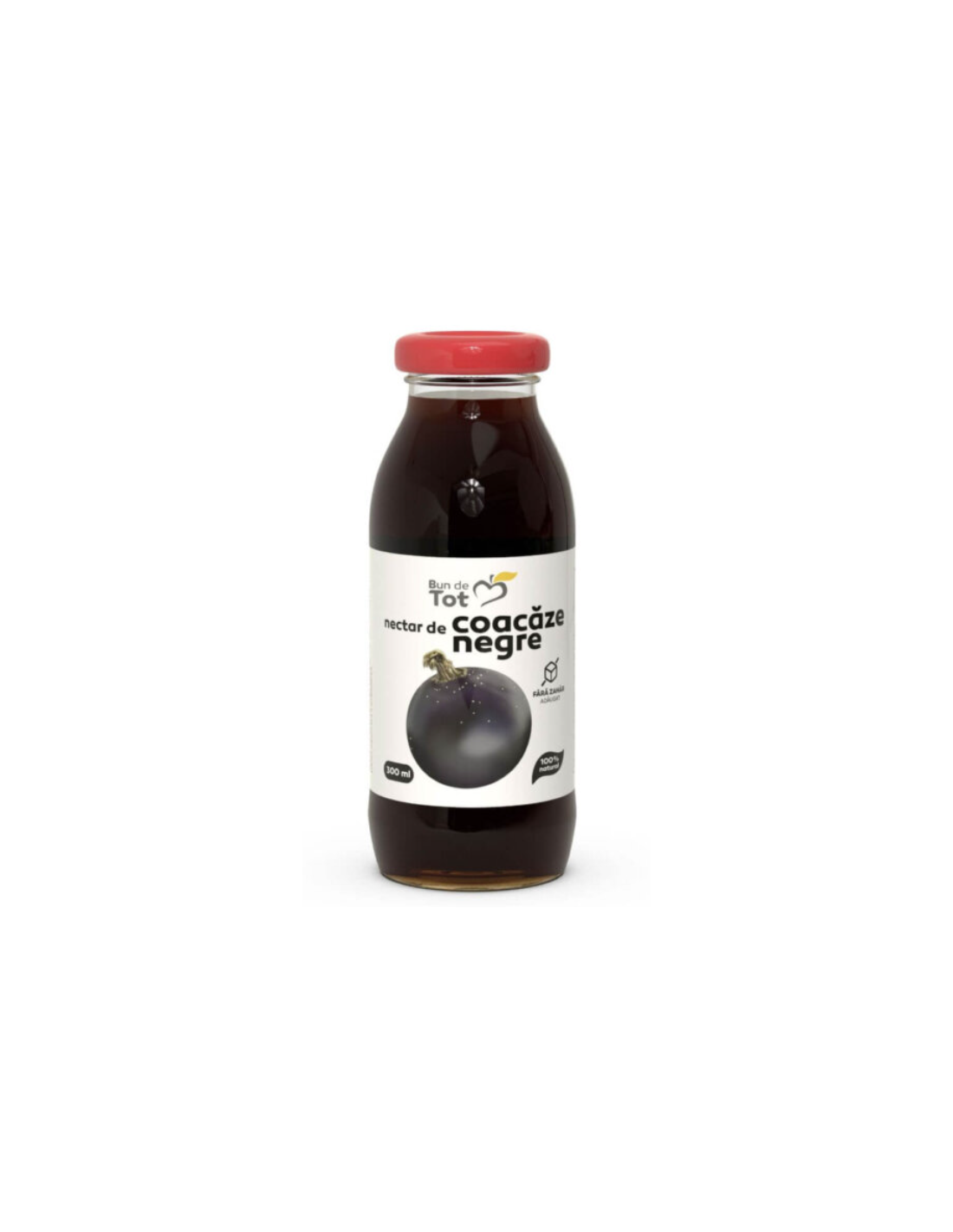 Nectar de coacăze negre „Bun de Tot” 300 ml de la Dacia Plant este un suc natural preparat din coacăze negre proaspăt presate, îndulcit natural cu suc de struguri. Produsul nu conține zahăr adăugat, conservanți sau aditivi artificiali.