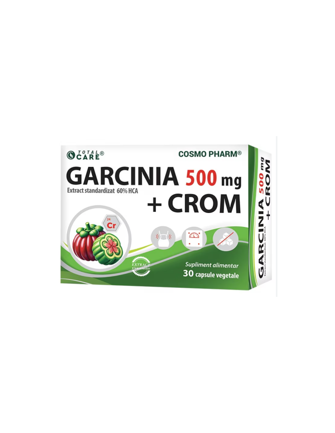 Garcinia + Crom este un supliment alimentar formulat pentru a susține controlul greutății într-un mod natural. Formula combină un extract standardizat de Garcinia cambogia (500 mg per capsulă, minim 60 % HCA) cu picolinat de crom, care joacă un rol esențial în reglarea metabolismului glucidelor și reducerea poftei de dulce.