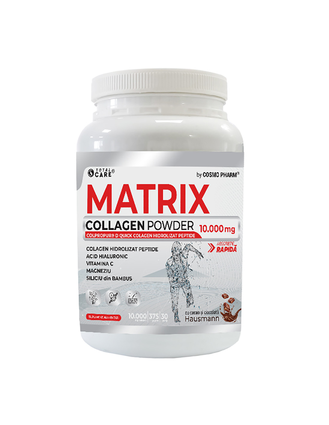 Matrix Collagen Powder 10.000 mg – 375 g este un supliment alimentar sub formă de pulbere, produs de Cosmopharm, care oferă peptides colagen hidrolizat de tip I și II în doză mare, plus ingrediente adjuvante pentru sprijinul țesuturilor și articulațiilor.