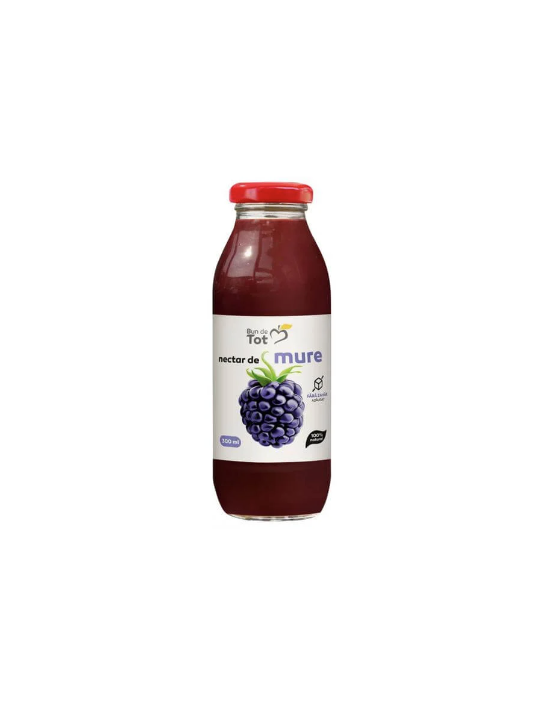 Nectar de mure „Bun de Tot” 300 ml de la Dacia Plant este un produs natural, obținut din mure atente selectate și îndulcit natural cu suc de struguri, fără adaos de zahăr, fără conservanți și fără coloranți.