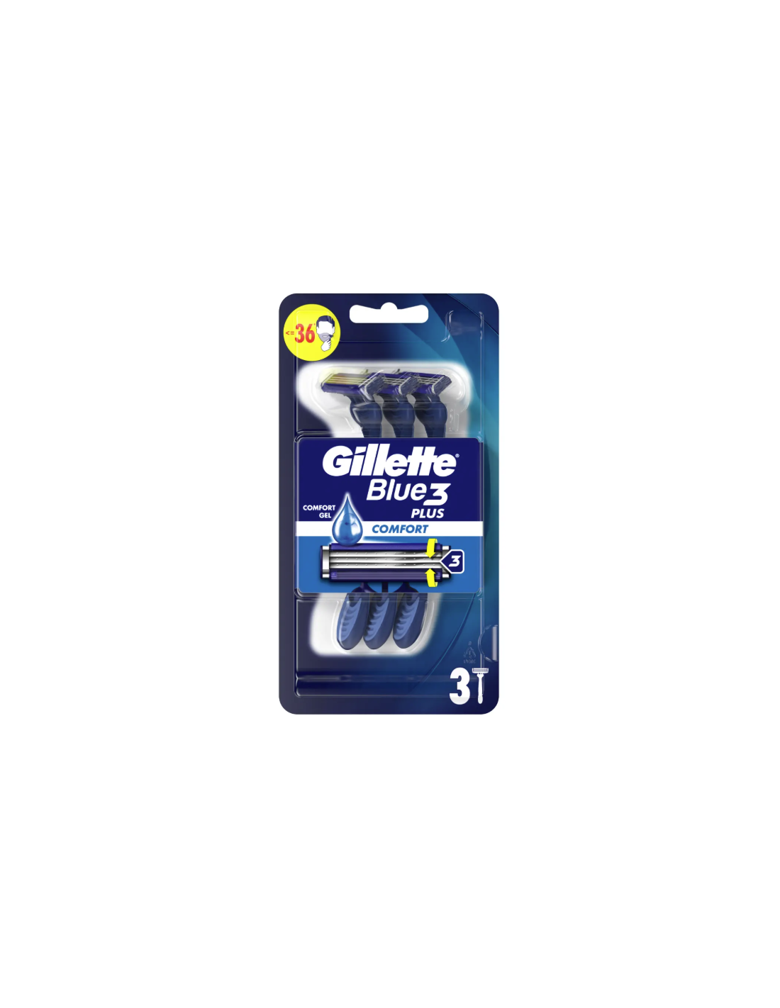 Gillette Blue 3 Plus Comfort este un aparat de ras de unică folosință conceput să ofere o bărbierire confortabilă și eficientă. Dispune de 3 lame sensibile care se adaptează conturului feței și un gel activator ComfortGel™ care se activează cu apa pentru alunecare sporită. Capul pivotant pe 40° contribuie la adaptarea la curburile feței și la reducerea iritațiilor.