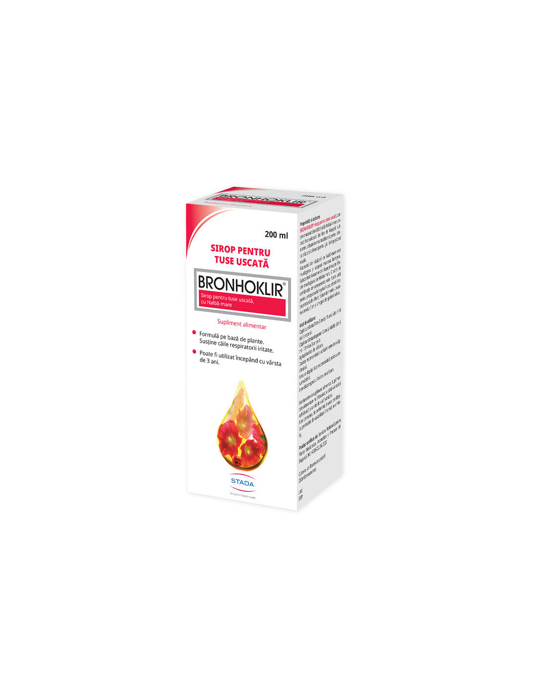 Bronhoklir sirop tuse uscată 200 ml este un produs pe bază de plante, destinat ameliorării simptomelor de tuse uscată, iritații ale gâtului și mucoasei faringiene.