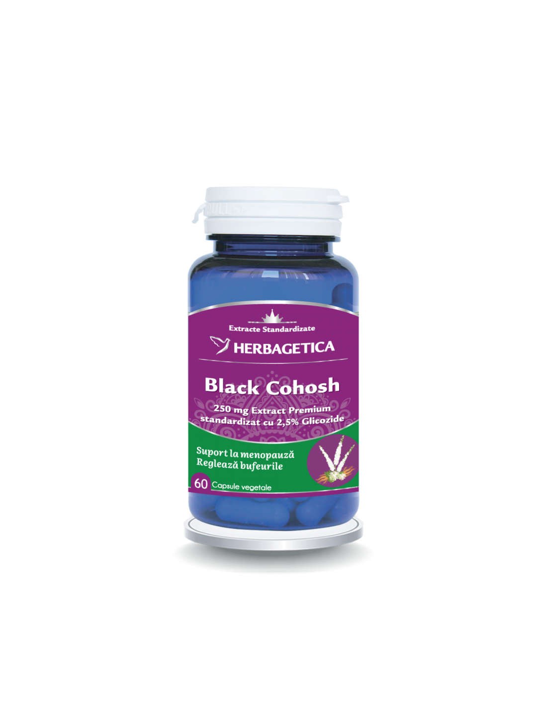 Black Cohosh este un supliment natural cu 250 mg extract standardizat de Cimicifuga racemosa per capsulă, dedicat susținerii confortului femeilor aflate în menopauză sau premenopauză.