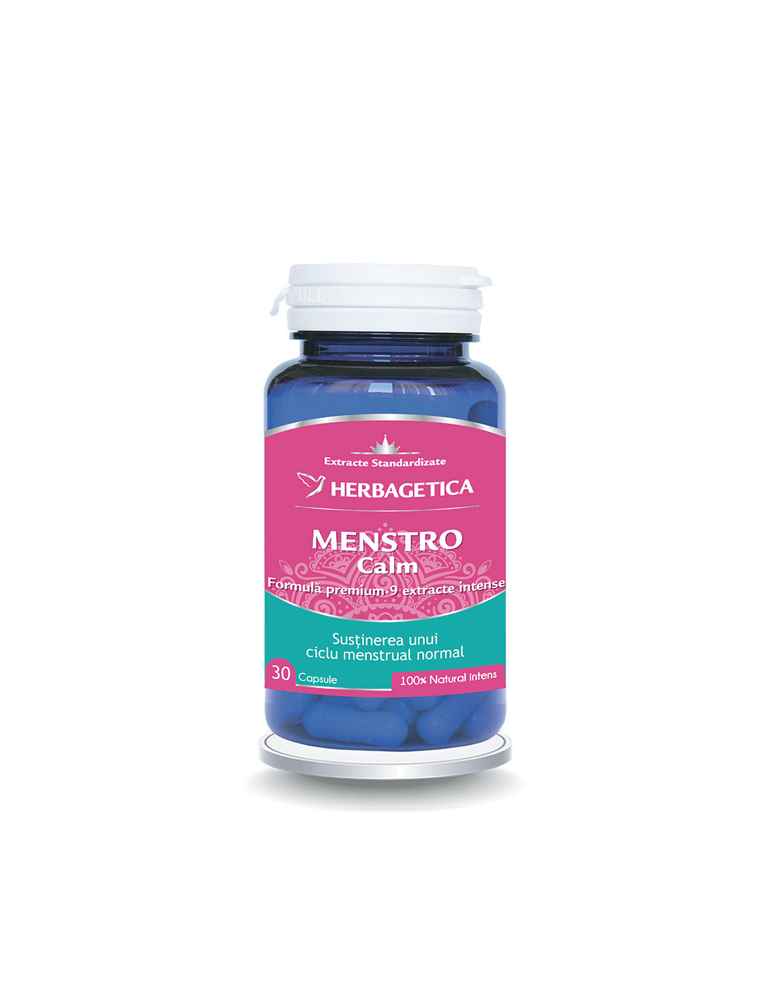 MenstroCalm – Herbagetica este un complex natural cu 9 extracte concentrate, creat pentru a reda confortul fizic și emoțional înainte și în timpul menstruației. Formula sa reglează echilibrul hormonal, reduce crampele, susține energia și protejează sistemul reproducător feminin.